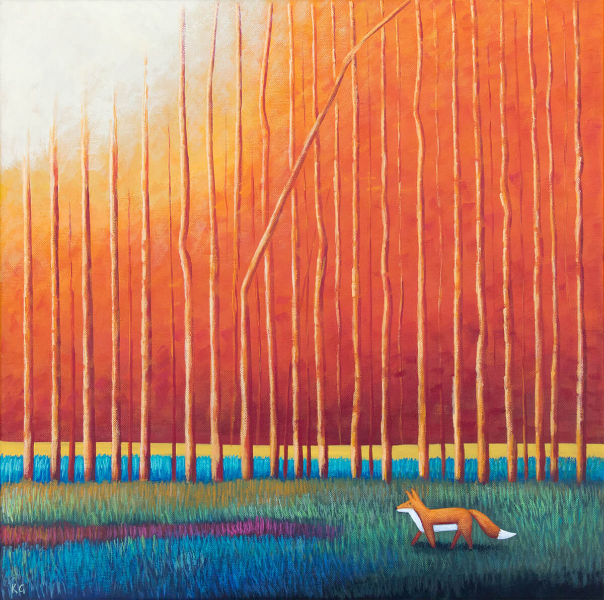 A lone fox takes a sunrise stroll through an orange-hued forest along the green-shadowed grass towards a shaft of dawn light that spills onto the ground. The colours are reflective of the early hours of day and utilises a dry brush textured effect. The intent is to evoke a sense of tranquillity, the viewer is drawn in to either appreciate this tranquillity or to feel transported to the forest in their imagination. Part of a series of paintings revolving around the adventures of Frankie the Fox exploring the natural world and the wonders to be found throughout. This painting would make a striking piece for any collection in the home or office, being a great conversation piece. Painted on quality canvas, hooks and wire on back so ready to hang. Sides also painted in a continuance of the composition, so no need to frame.