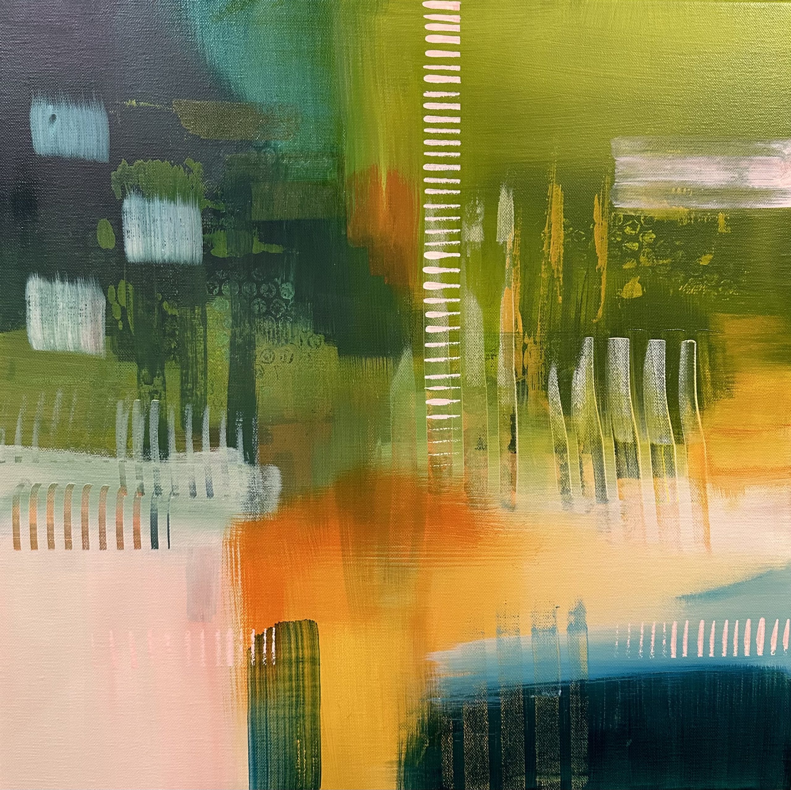 Part of a bigger series, where I’m exploring the endless possibilities with the same colours. This is a very bright piece with many layers of transparent fluid paint and the texture is built up with a variety of marks.