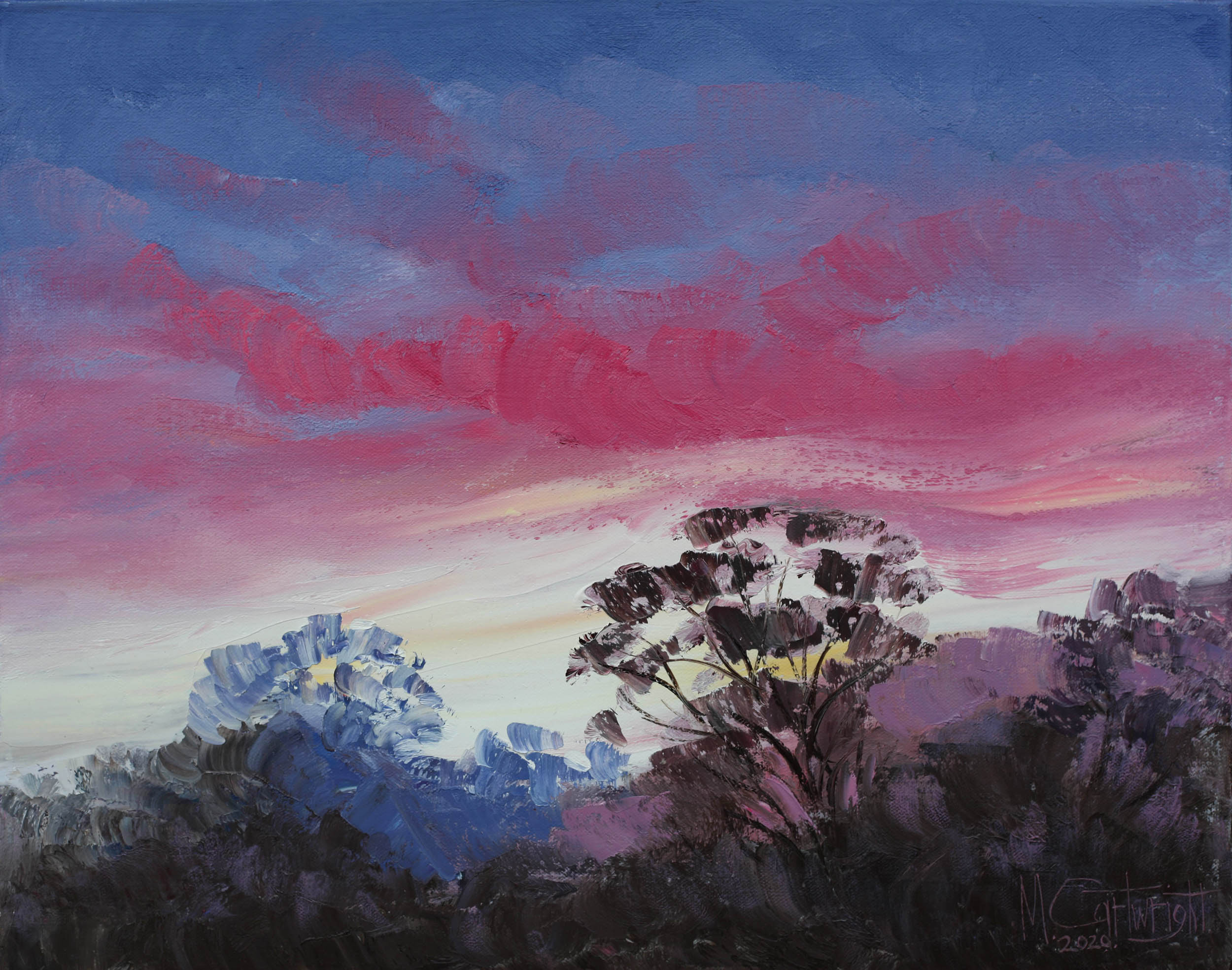 The sun begins to rise and the clouds turn pink. A forest of eucalyptus trees recedes into the distance and contrasts against the morning sky. A moment in time forever captured in this oil painting on canvas. The location is the beautiful tourist town of Denmark on Western Australia’s south coast. A beautiful part of the world where the forest meets the sea.
