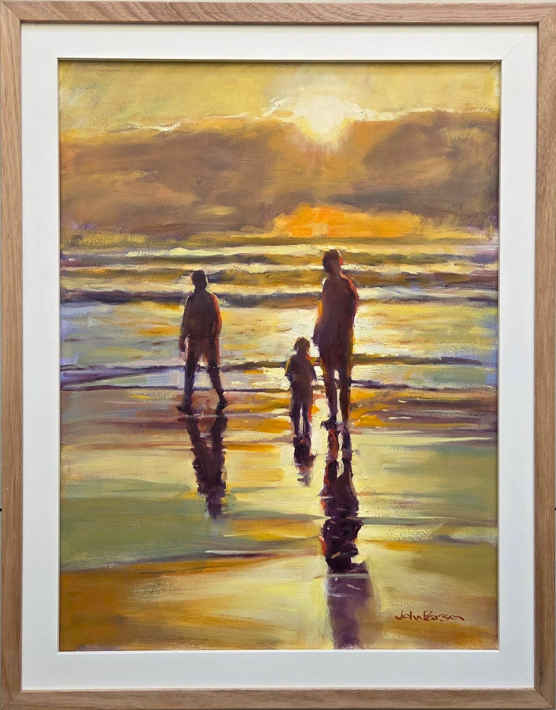 Sunrise Sparkle is an original oil painting by John Pearson – it shows a group of people silhouetted by a sparkling sunrise over the ocean.