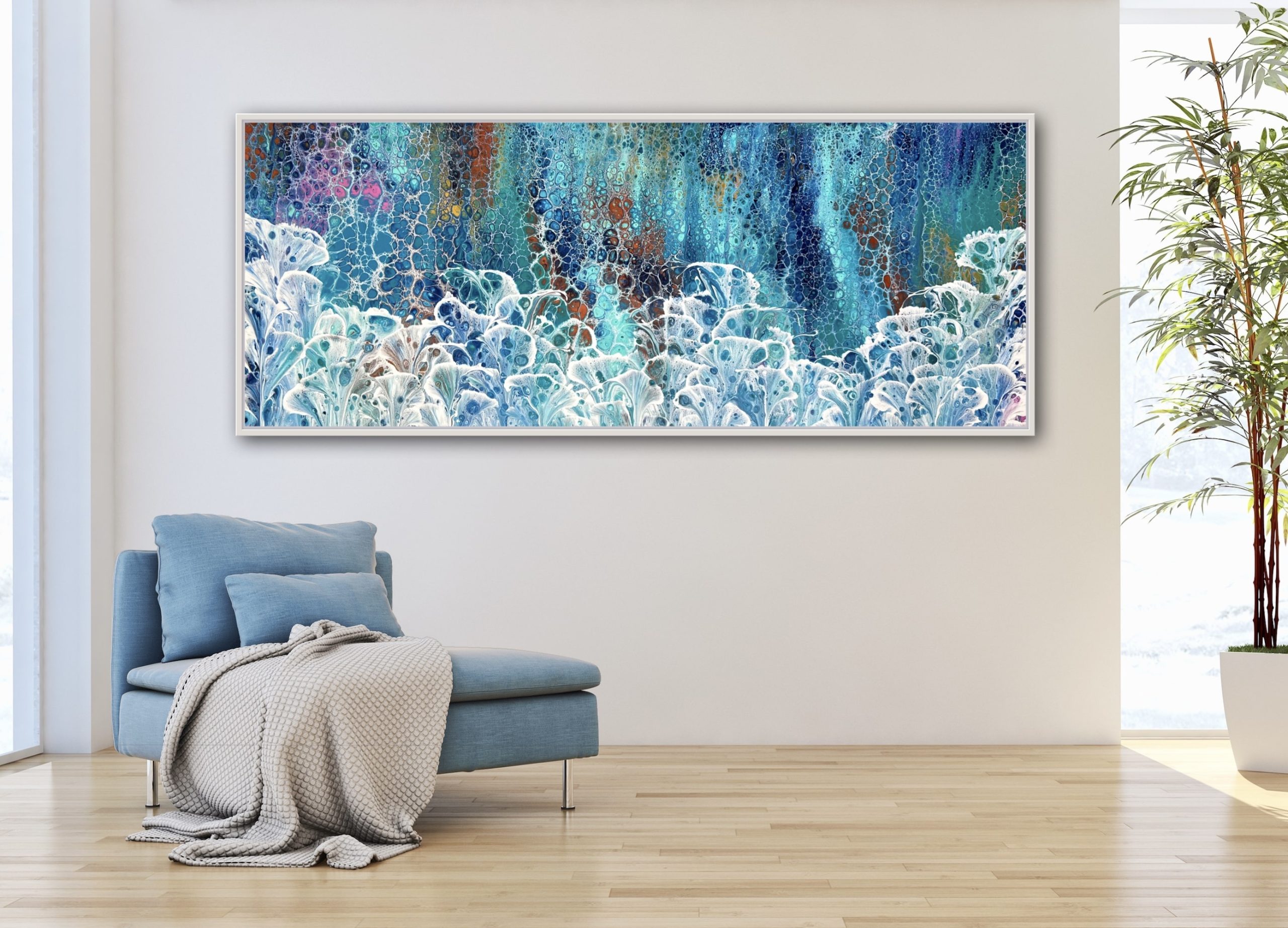 Sunrise Valley is inspired by nature and depicts in abstract Calla Lilies growing tall and in abundance with a lush valley full of colourful flora behind. Created using various techniques combined to allow increased flow, interaction and separation of colours to create interesting patterns where pops of colour can be seen emerging from underneath. This added dimension adds lace and cells to the artwork creating an interesting and one of a kind painting that can never be replicated.
