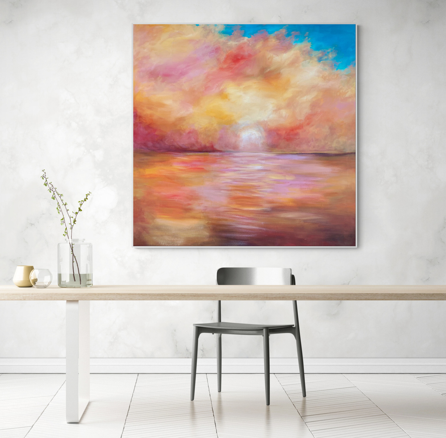Sunset by Theo Papathomas a Sunset a painting celebrating colour and light. A very soothing and tranquil painting where sky, clouds, water, sun come together to create this beautiful harmonious landscape . Capturing the beautiful and rich colours of the sun falling on to the landscape creating a musical symphony of colours. I tried to create so much depth in the painting, painted in expressionistic way with acrylic paints .A very harmonious composition of warm colours that makes it a very poetic and romantic painting .The painting does not come with an external frame. The painting is signed and dated 2021 at the back and comes with a certificate of Authenticity.