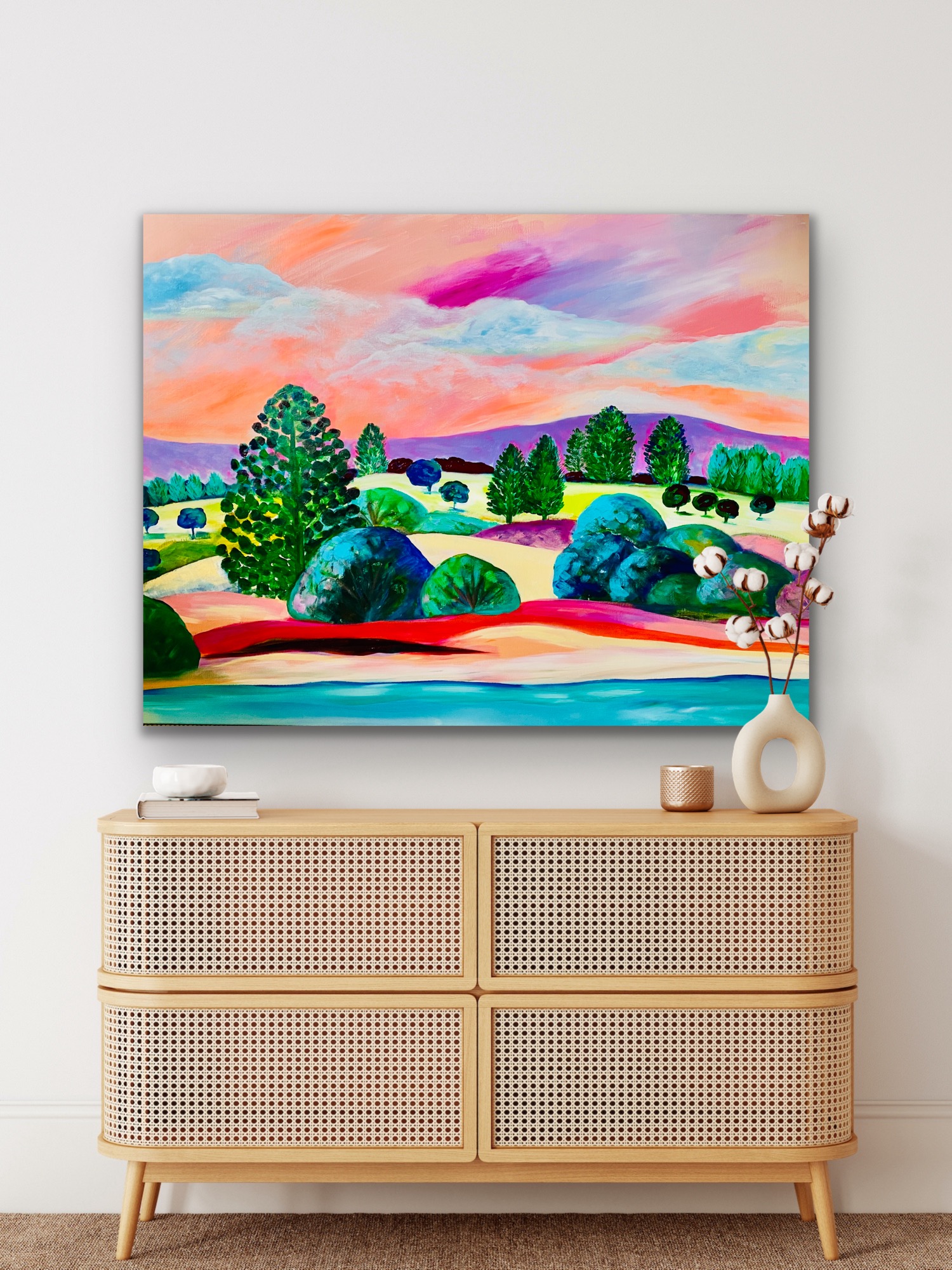 This original, one off artwork was inspired by a brilliant apricot sunset after rolling Summer storms in the countryside outside of Marburg. I love painting the land of my hard working relatives, who have established and owned dairy farms in this area, in the rolling hills that extend to the Great Dividing Range, just outside of Brisbane.