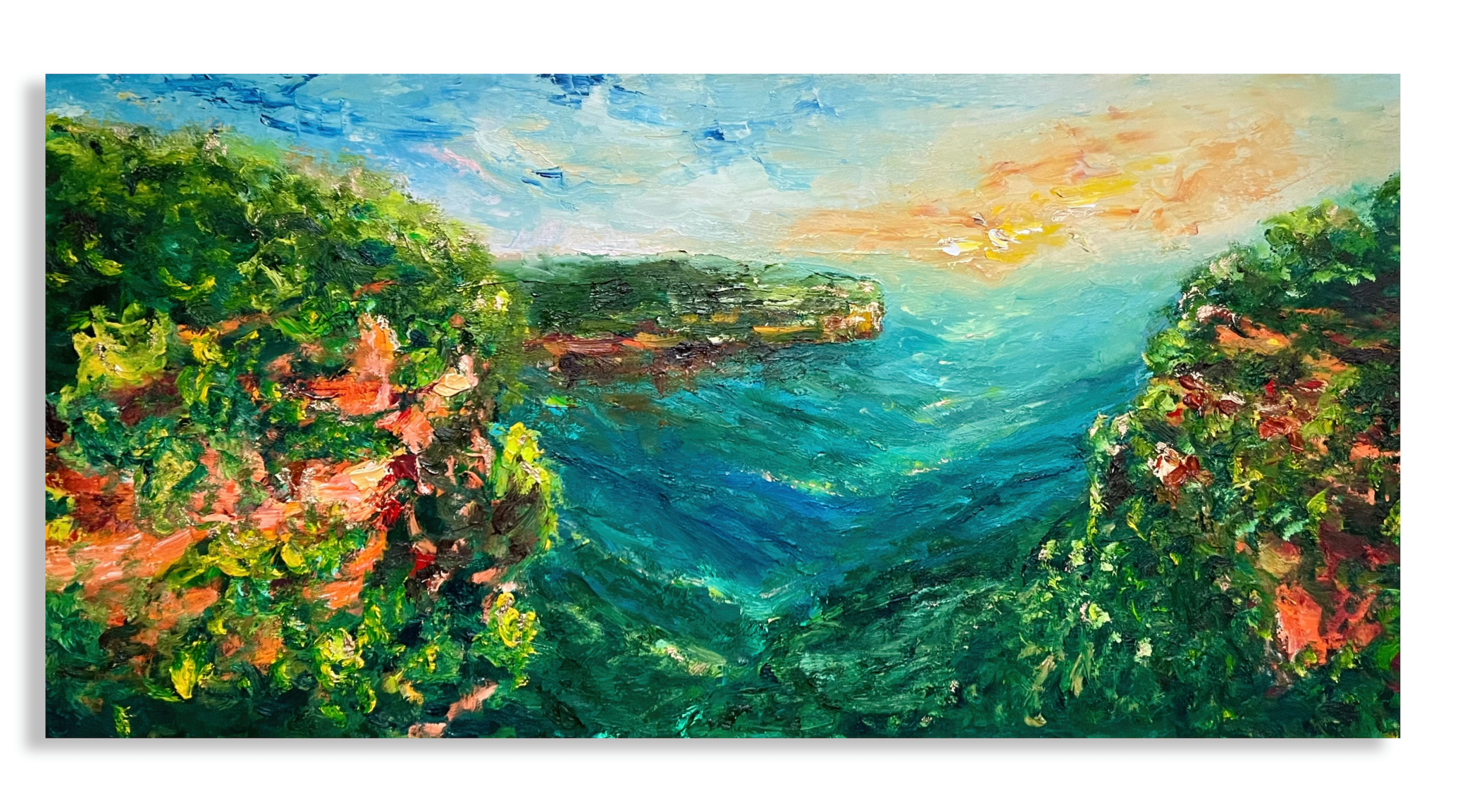 Some of my canvases are ordered with a float frame, usually the most popular is a Tasmanian oak frame. If you prefer to frame the piece once the painting is finished, I can assist you in organising a custom frame or you can choose to arrange framing yourself.