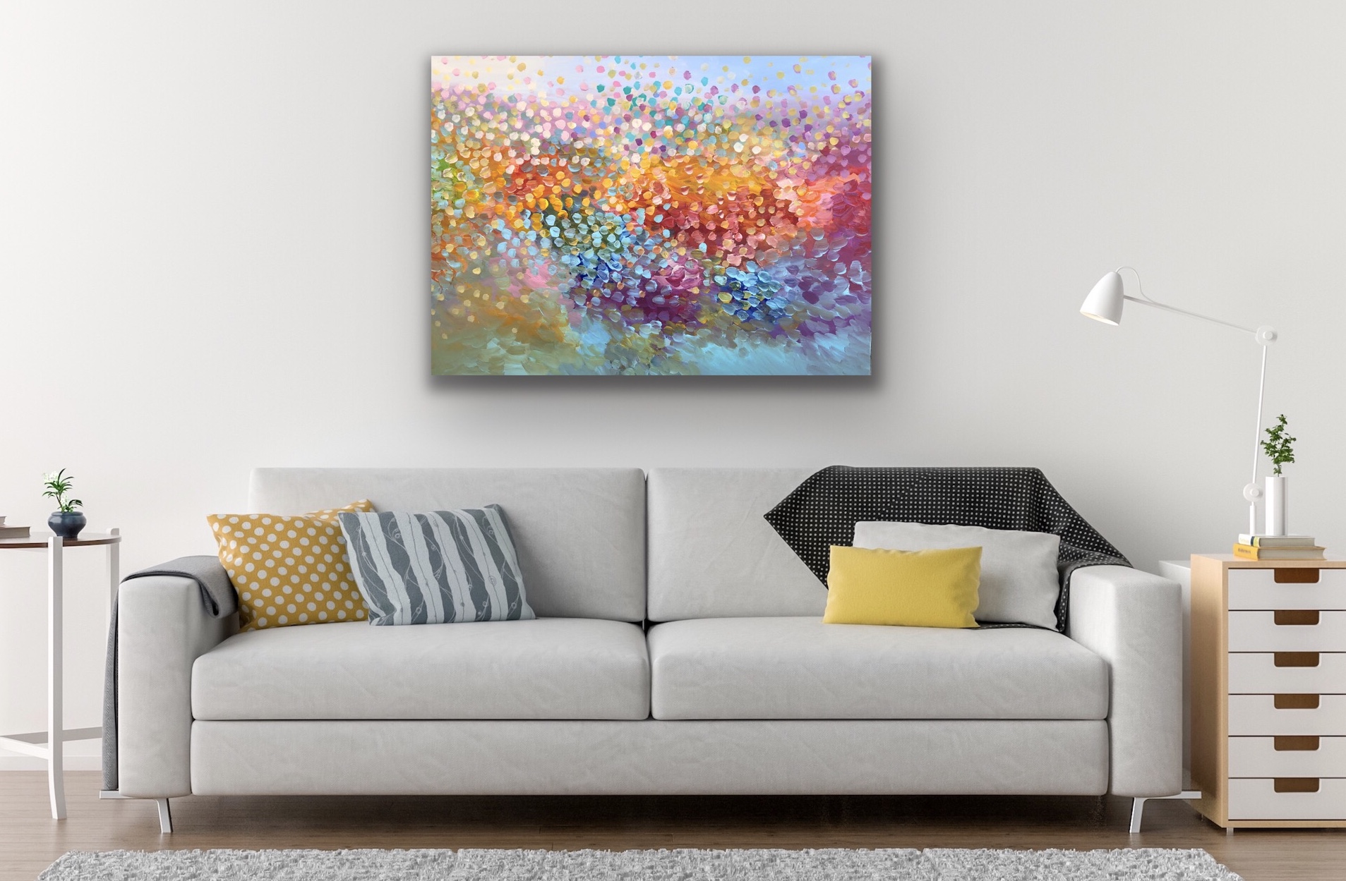 Sunset Beauty by Theo Papathomas – Â A very soothing and tranquil painting where sky, clouds, sun, water and petals come together to create this beautiful harmonious landscape. Capturing the beautiful colours of the petals falling from the sky onto the landscape over the hills and waterfalls with the rays of the sun falling onto the petals . I tried to create so much depth in the painting A very harmonious and tranquil composition that can be enjoyed many years to come. The painting is signed and dated 2020 at the back and comes with a certificate of Authenticity.