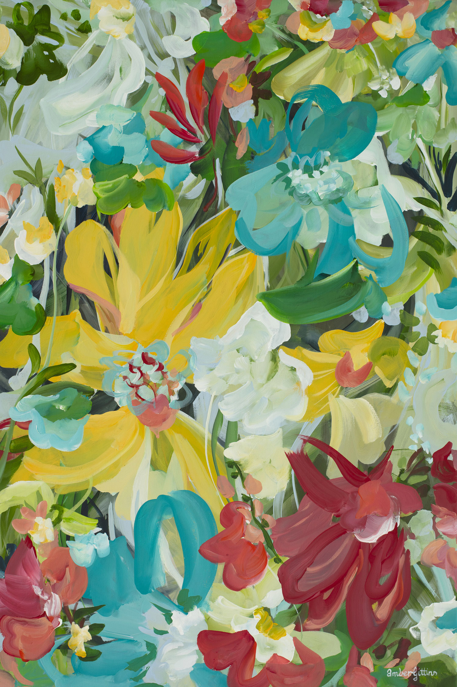 Sunset Florals by Amber Gittins – 61x91cm Colourful abstract flower original painting depicting tropical bold flowers in a landscape garden scene. A colourful and fun palette of light blues, yellows, reds, teals and greens that would bring colour and happiness into your room.