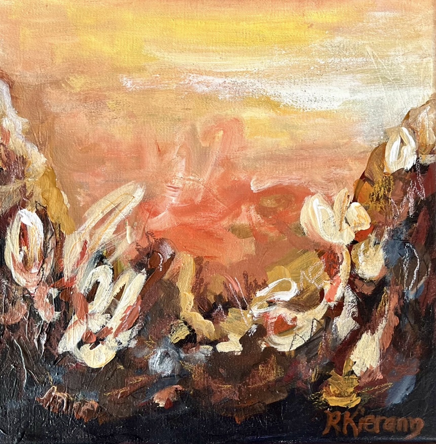 Sunset Haze evokes the warmth and glow of a sunset, using a palette of warm tones of oranges, yellows, and soft earthy browns. The sky in the background transitions from a bright, sun-kissed yellow to deeper oranges and reds, reflecting the fading light. The foreground features abstract organic shapes, suggesting flowers & rocks, rendered in loose brushstrokes of white, brown, and earthy tones. These forms contrast against the warm background, giving the piece texture and depth. A sense of movement and natural beauty, reminiscent of a hazy, glowing landscape at sunset. The earthy, layered textures add richness and a grounding element to the scene.