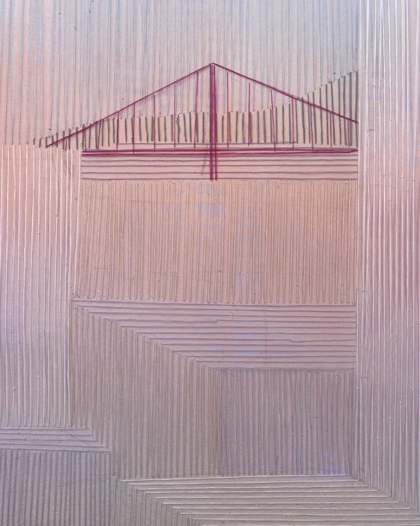 The artist’s technique combines the fluidity of spray paint with the delicate precision of hand stitching. Beneath it all, a soft spray-painted grid subtly overlays the surface—hinting at the human presence of planning, structure, and design that underpins the urban landscape. This original mixed media artwork is made on handmade fine art paper with beautiful deckled edges.