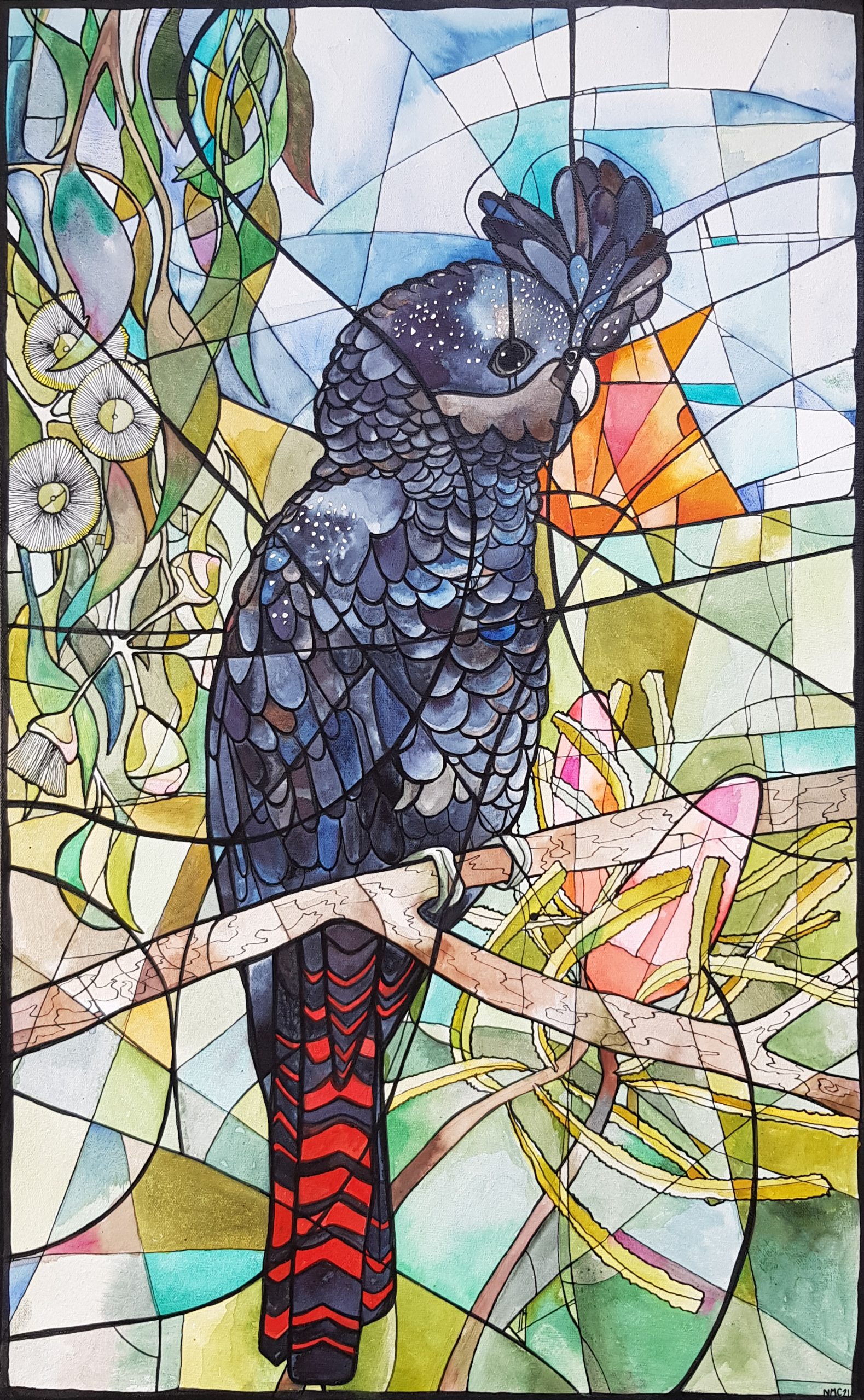 Sunset in the Avon Valley is a watercolour and ink depiction of the stunning red tailed black cockatoo common to the area. Perched on a branch with flowering gums and banksias against a stylized background.