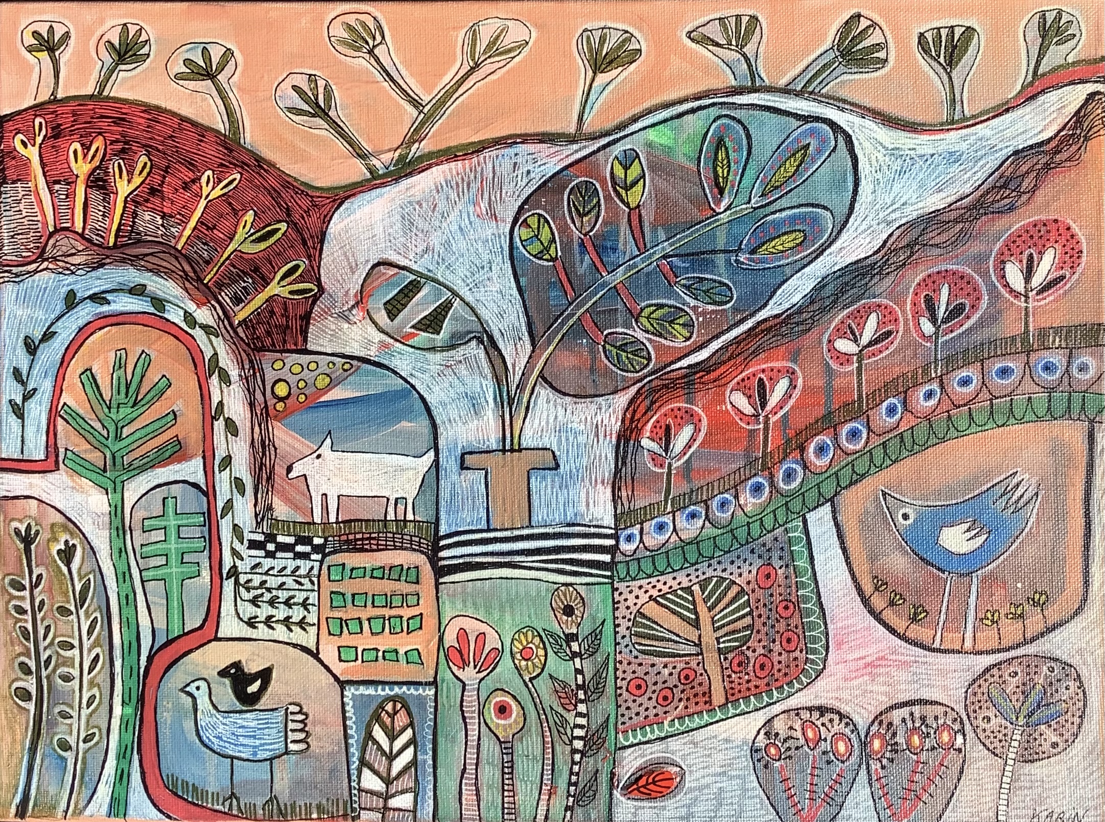 Sunset in the Hills by Karin Hotchkin – Inspired by the amazing pink sky’s and sunsets portrayed in a whimsical naive manner reflective of the land and the landscape in a country scape. Spot the dog and the birds, bit of fun and full of patterns colour and shapes with a strong focus on design mark making and composition. Acrylic on canvas with mat finish ready to hang