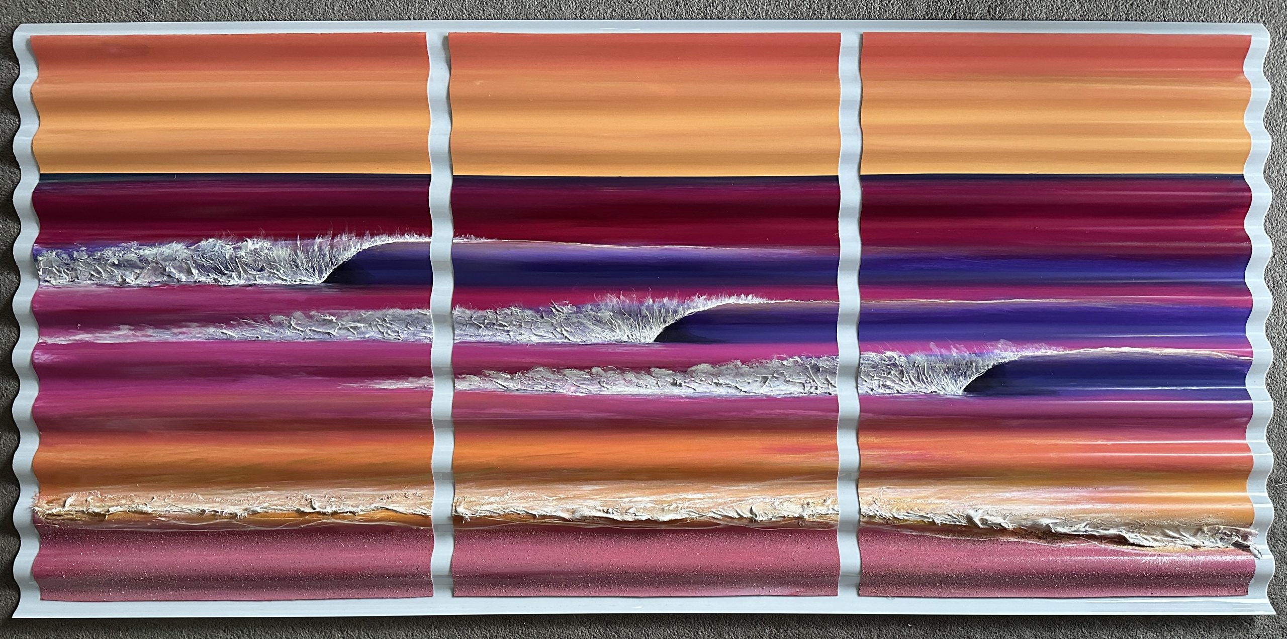 Sunset Orange by Adam Stanley – in this painting I have created a 3D depth in the waves by painting on corrugated polycarbonate. Â These paintings are outdoor resistant and hang flush on a wall even better than other paintings.