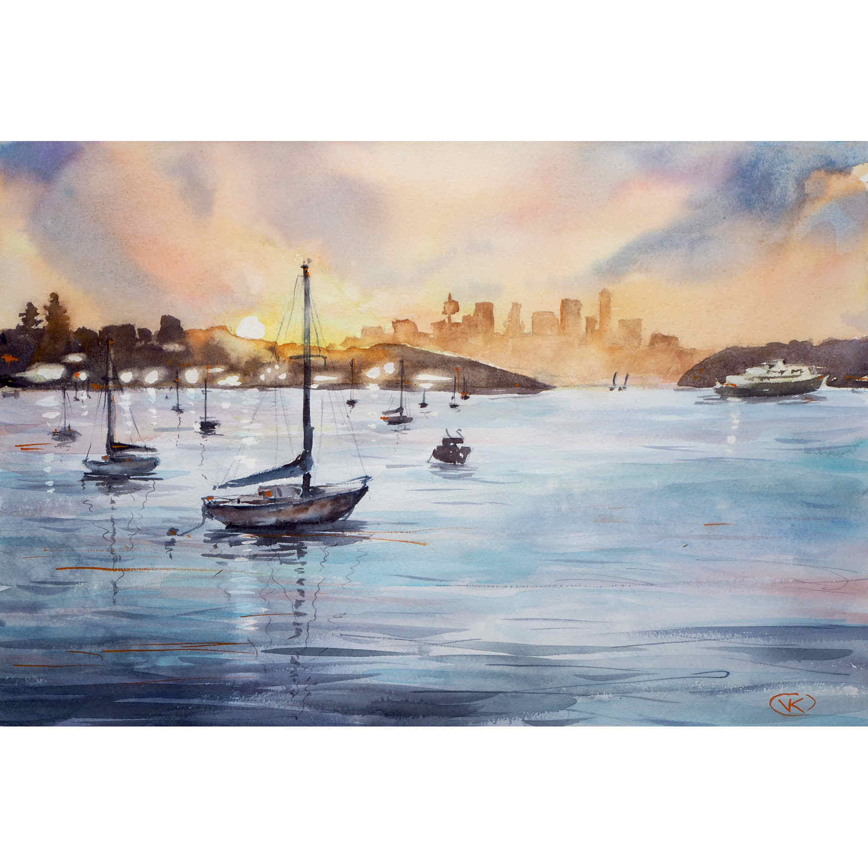 Australian seascape, Ocean, Boat, Clouds, Sunset. Original Watercolour on 300 gsm paper.