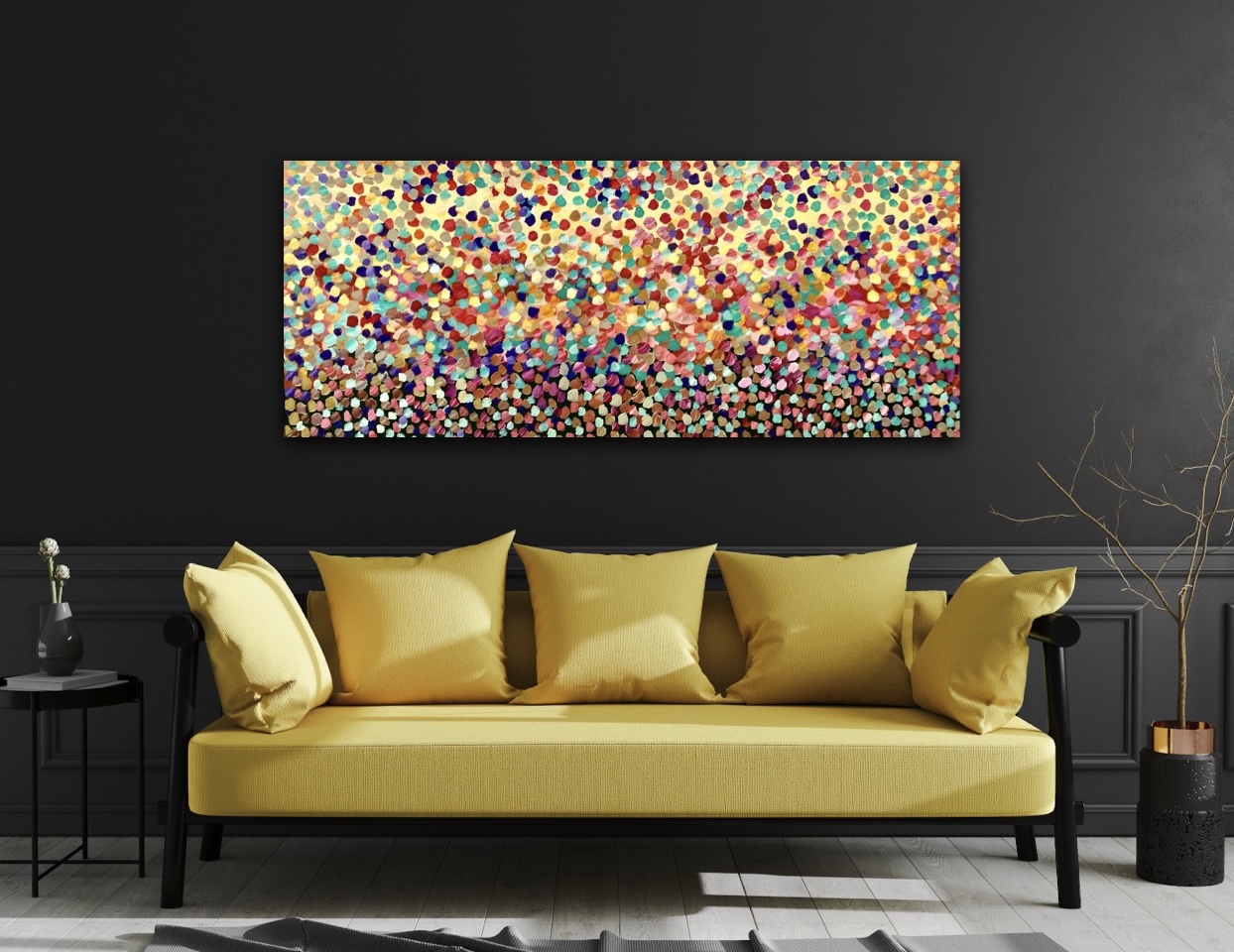 Sunshine by Theo Papathomas a bouquet of petals in the sky weeping onto the landscape. The light of the sun in the background shining on to the petals makes the whole painting feel very warm and happy. Fireworks of petals light the whole sky like musical notes dancing to their own rhythms creating a beautiful colourful rainbow bouquet . Hope with this work it makes the viewer feel very peaceful and tranquil. I tried to create so much depth in the painting with a beautiful sunset colours in the sky . The painting is signed and dated 2022 at the back and comes with a certificate of Authenticity.