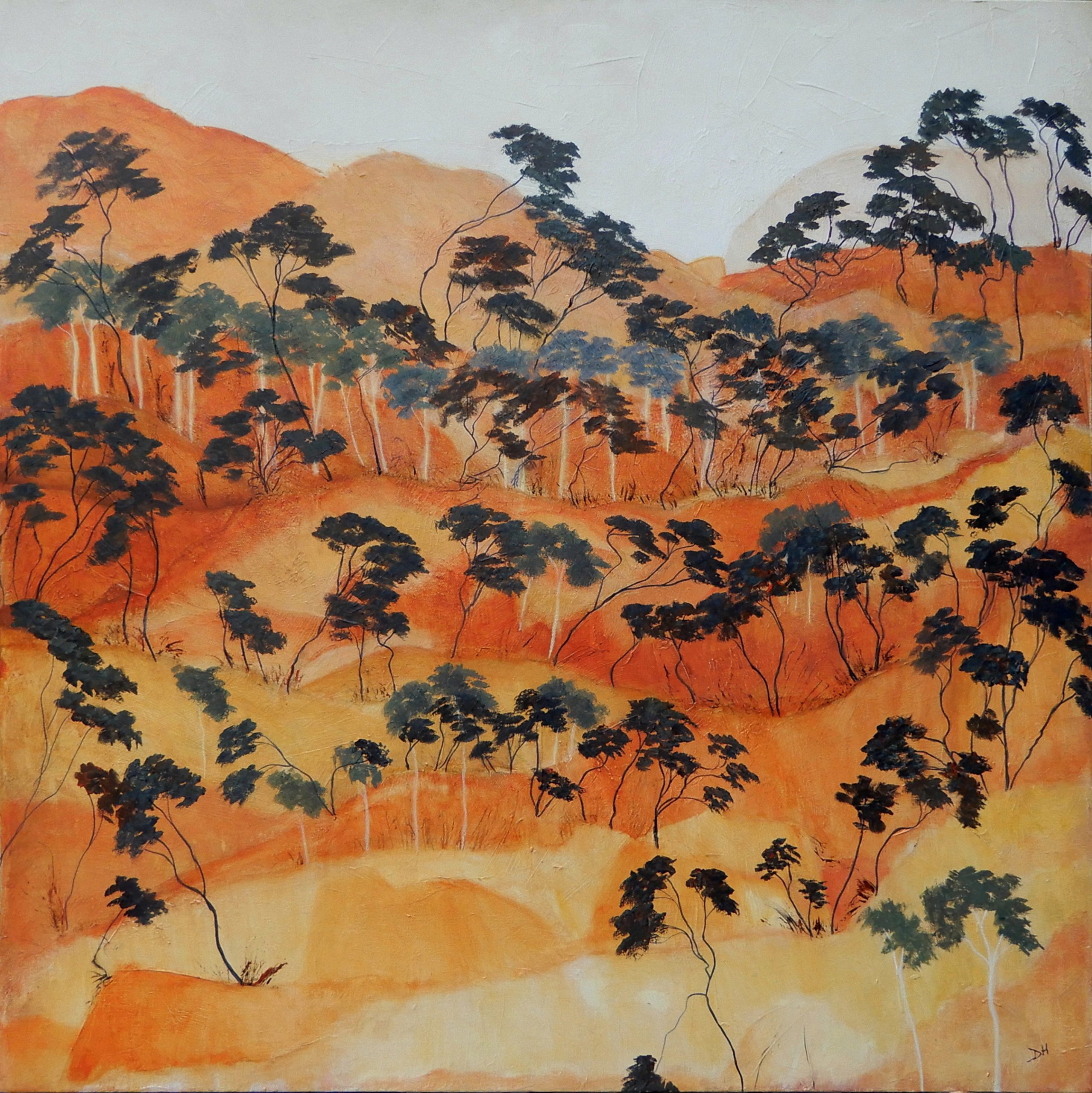 This bold colourful abstract landscape is inspired by the undulating ridge lines in the Red Centre. I love the way eucalypts find a way to spread their roots and find nutrients in what appear to be inhospitable environments. They are such survivors.