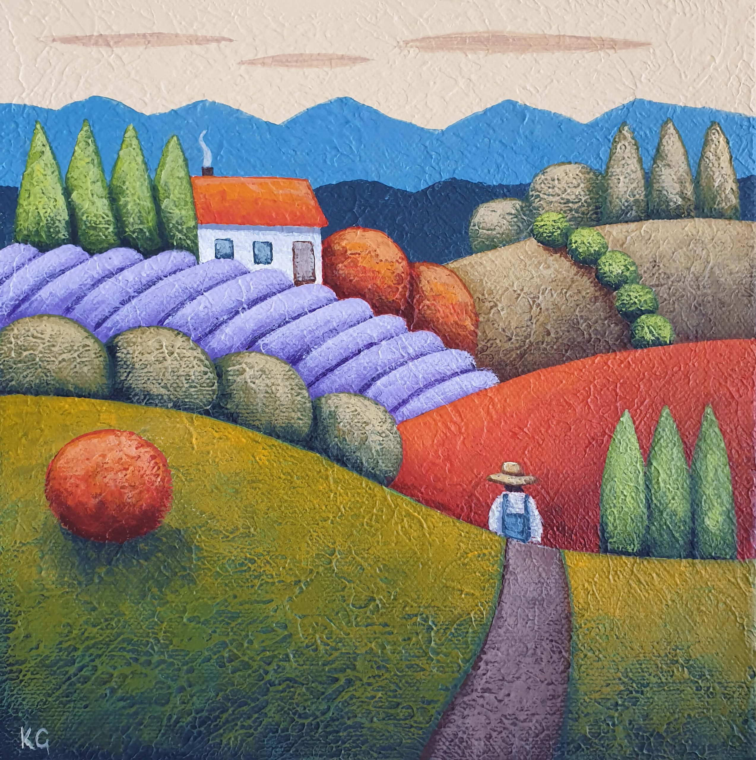 This small canvas features rolling fields, trees and a single country house with a farmer walking along the path. Mountains in the background underneath a yellow sky. With an under-painting of texture, this piece is given dry-brush charm with an abundance of texture throughout the canvas. The vivid colour scheme is warm and cheerful, being a striking piece to add to any collection. This style provokes the ideas and expectations of the colours around us and seeks to explore how those colours have an effect on the viewer. Painted on quality canvas, hooks and wire on back so ready to hang, but can also rest on a shelf. Sides painted in continuance of composition.