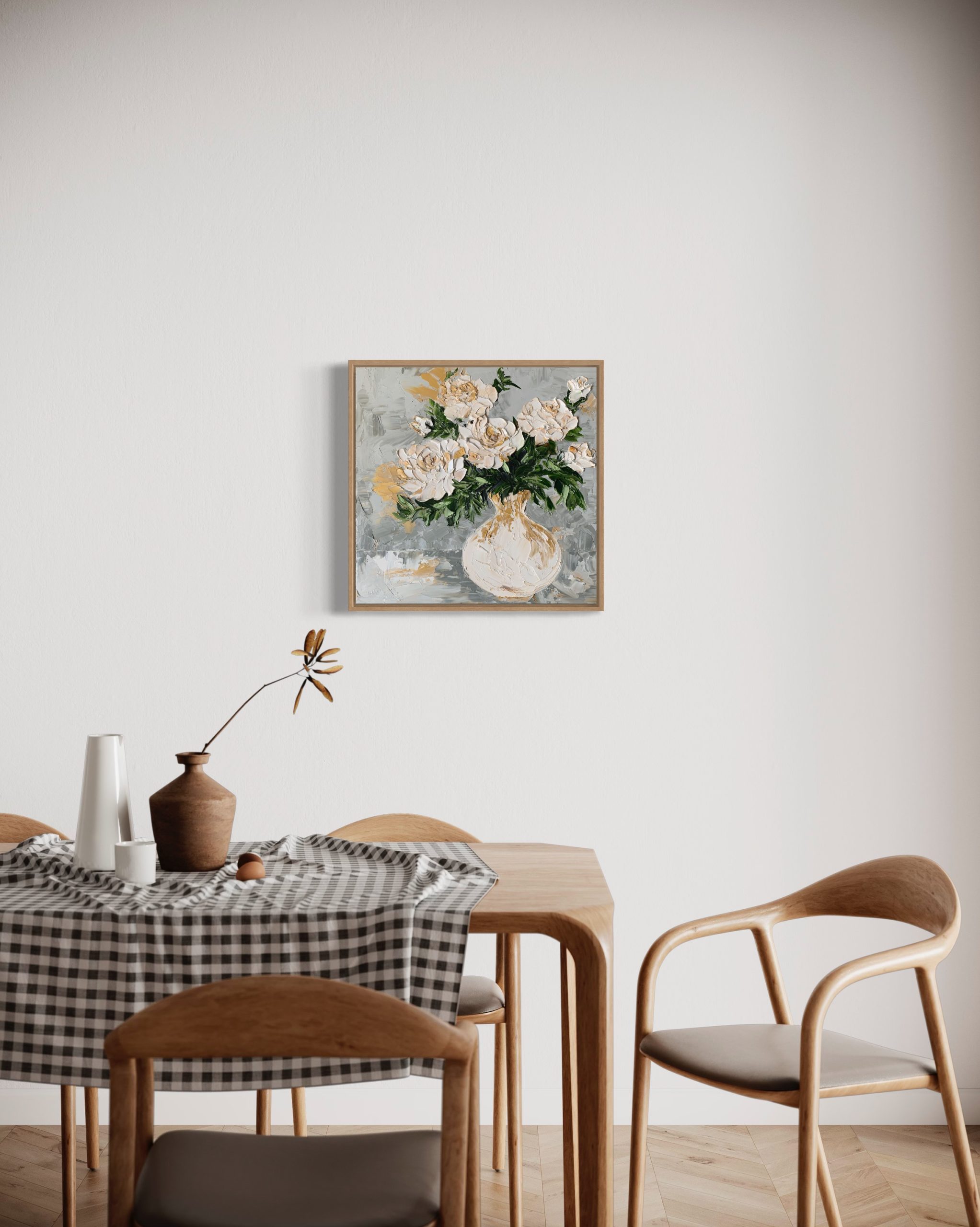 My textured impasto still life, featuring white and gold roses in a white and gold vase with dark green leaves, seeks to capture the interplay of light, texture, and colour. Through thick, expressive brushwork and layered impasto technique, I aim to convey the tactile essence of each element in this composition.