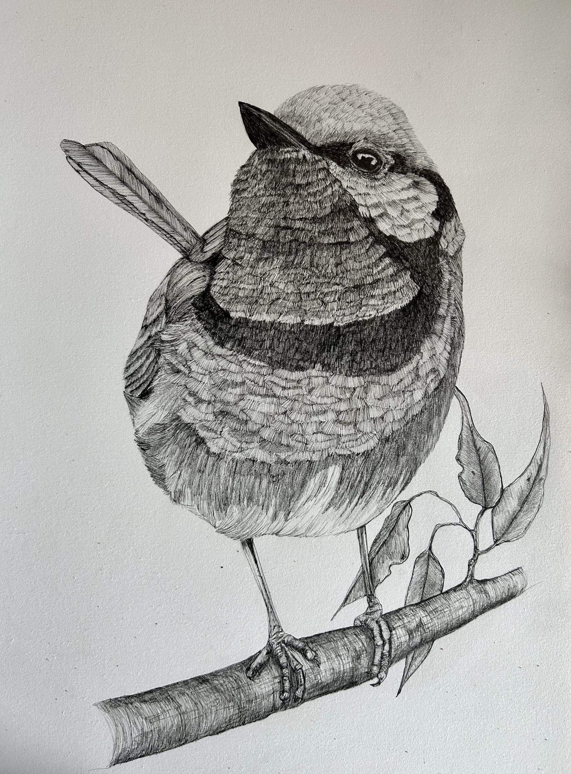 Superb Fairy Wren among the Eucalypts is an original artwork that was hand drawn by Sharon Grima.