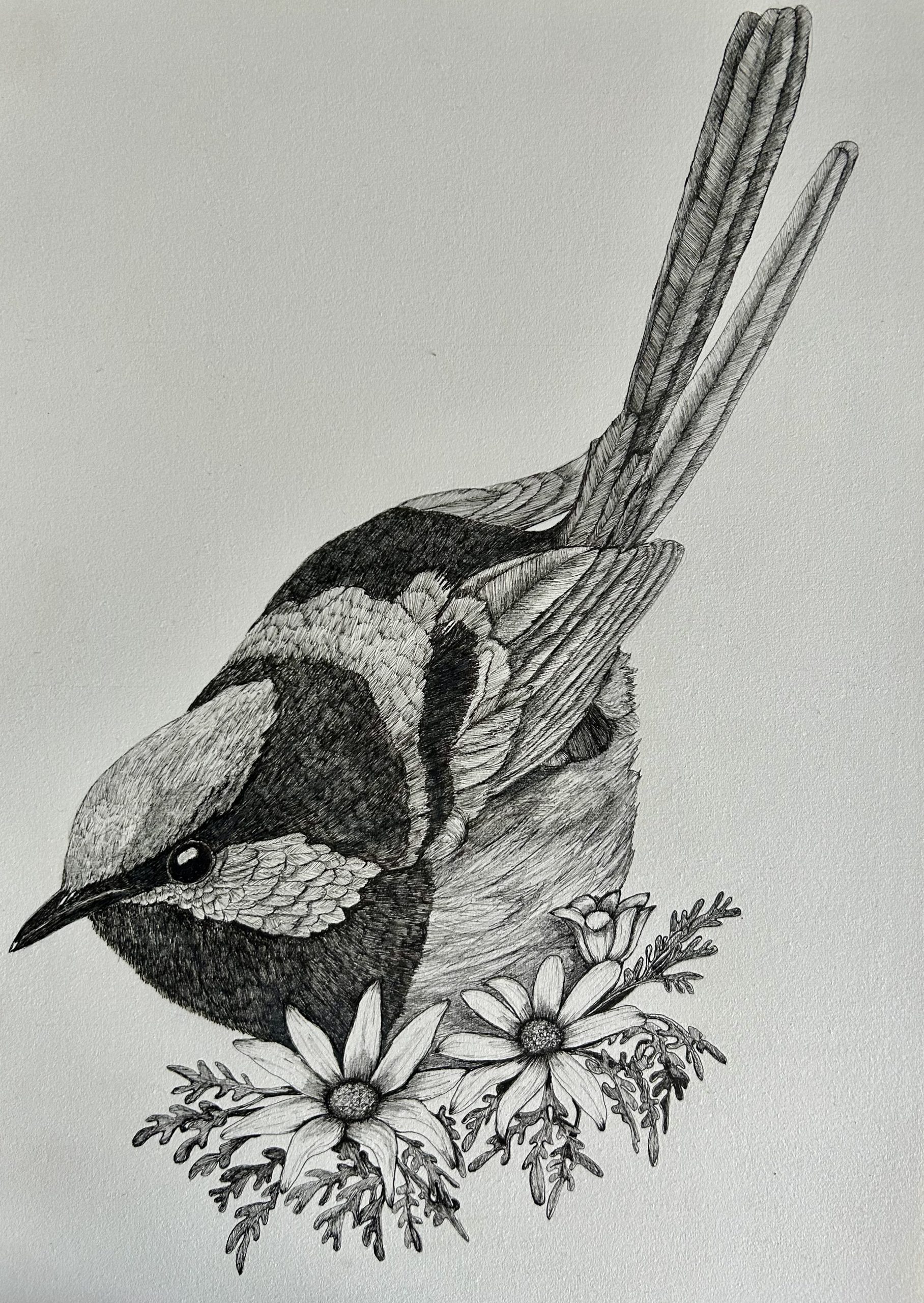 Superb Fairy Wren with Flannel Flowers is an original artwork that was hand drawn by Sharon Grima.