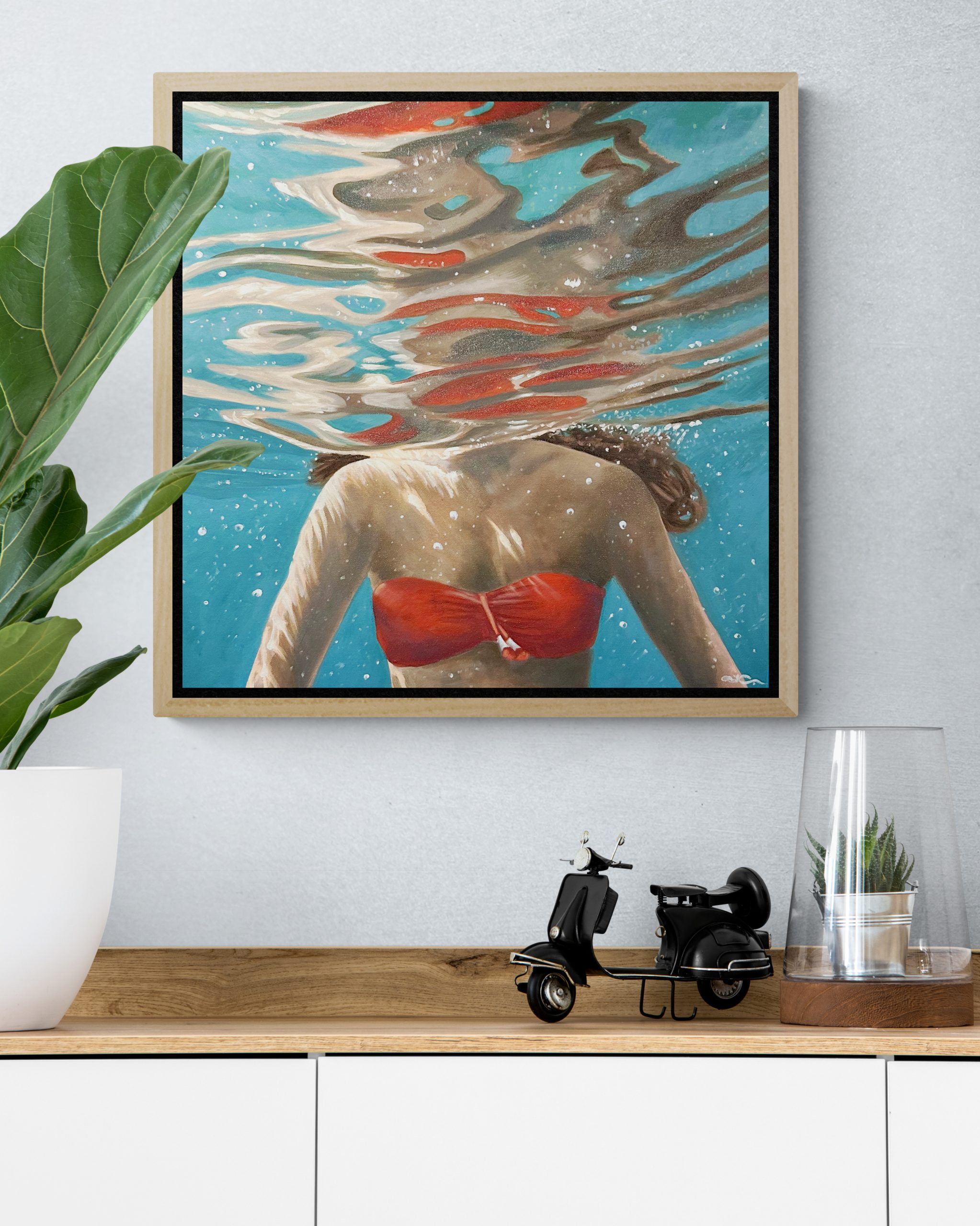 Surface Tension by Amanda Cameron – is one of a new series called ‘Salt Water’. While still exploring the interaction and connection between water, light and form, this series also analyses the sense of disquiet when swimming in deep ocean water. At the same time, the main focus is the quest for refuge, quietness and escapism. These paintings juxtapose the lone swimmer and a few minutes of introspection when alone in deep water against the fear of the unknown. The constant struggle between hyper-realism and having a painterly quality to my work is a conflict I always try to balance; therefore, thick paint and evident brush strokes are present when viewed up close. This piece is painted in professional oil paints on a museum-quality canvas and finished with edges painted, varnished for protection and framed in a quality oak floating box frame. It comes ready to hang and includes a certificate of authenticity.