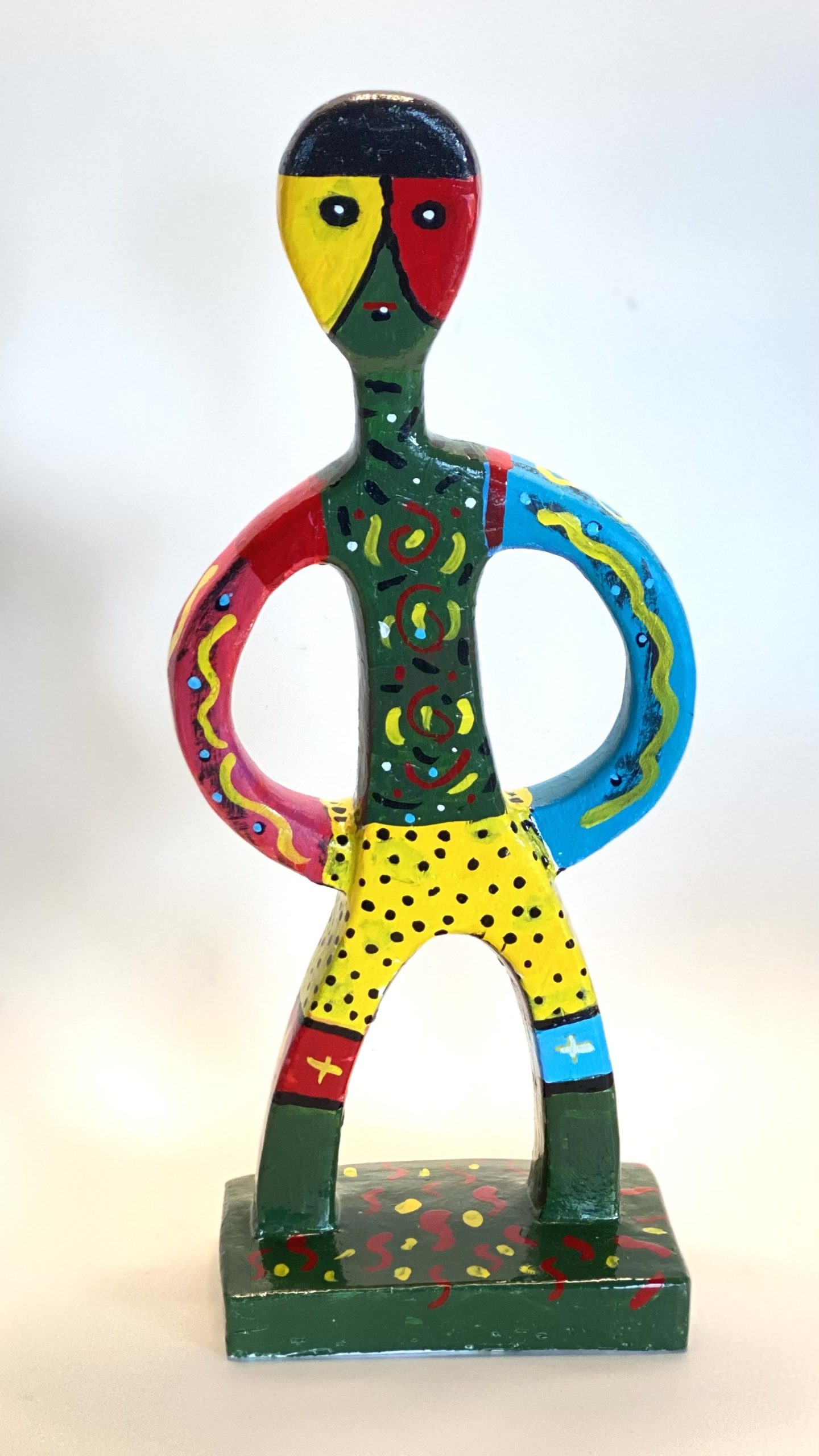 “Surfing Champion” Original sculpture by Stefan Mager. Mixed media, ceramic core, enamel paint, gouache. A very bright and positive figurine capturing the intense freedom and delights of surfing the ocean.