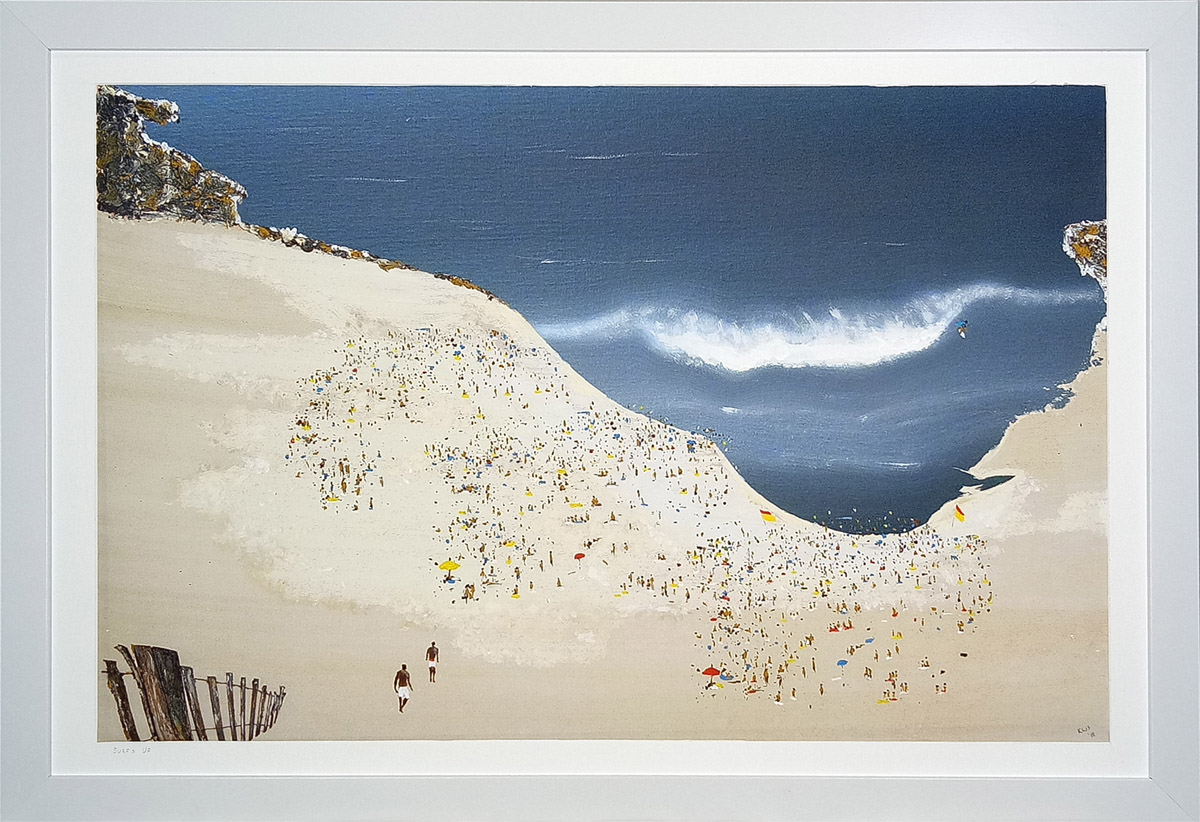 My inspiration is drawn from many years spent at the beach during summer (Australian east coast). It was often a long walk to the beach over hot sand, negotiating a path through my fellow beach-goers and (hopefully) finding that perfect wave. The sand is covered in colour by sun bakers and their towels and beach umbrellas. The colourful surf flags define the safe swim areas and serve to concentrate activity and colour in the warm waters. The crowds would often disperse after midday as the nor-east winds came ashore, chopping the sea and surf and displacing many a beach umbrella. Wonderful memories.