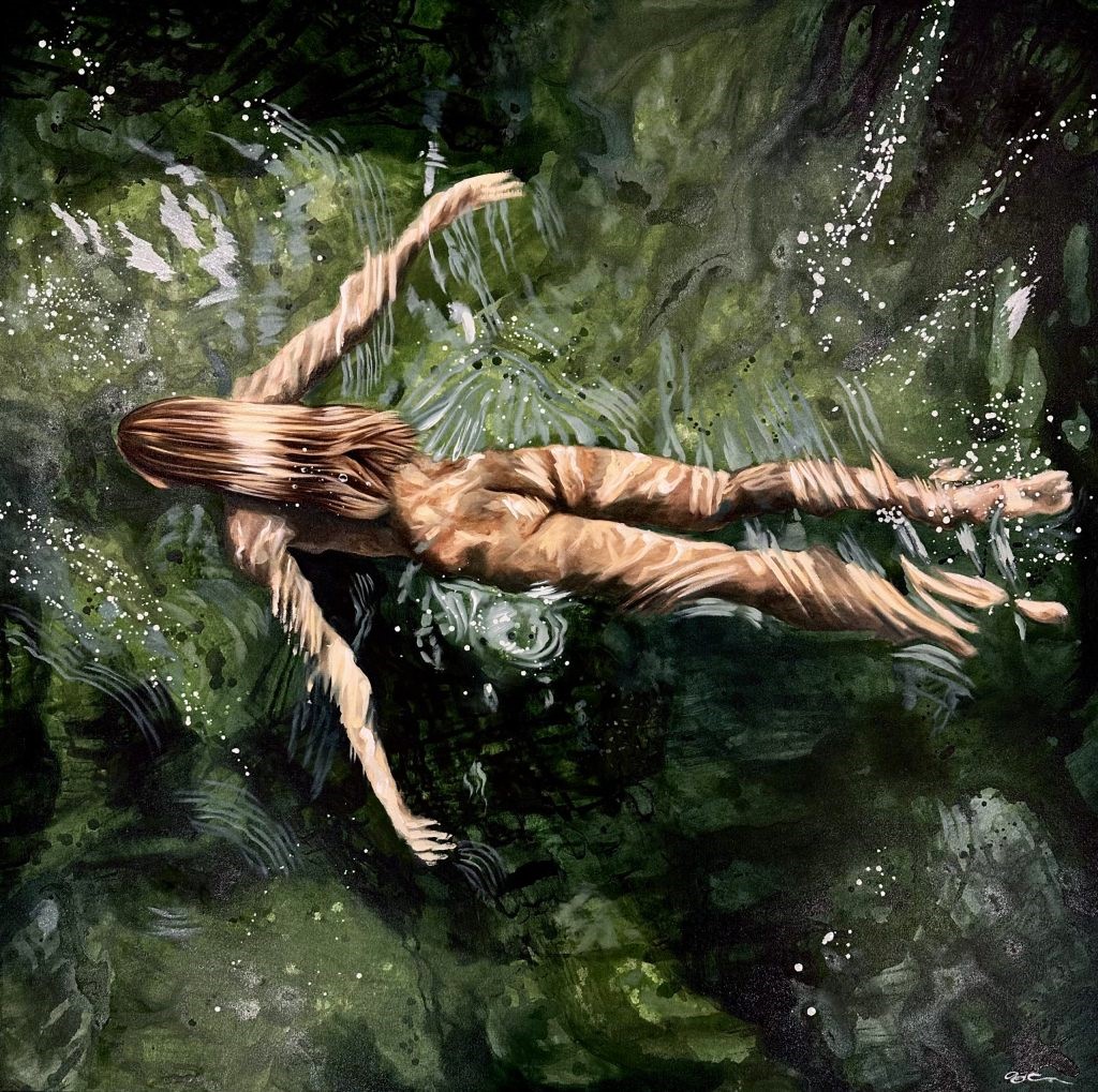 Suspended Light by Amanda Cameron – is one of a new series called ‘Salt Water’. While still exploring the interaction and connection between water, light and form, this series also analyses the sense of disquiet when swimming in deep ocean water. At the same time, the main focus is the quest for refuge, quietness and escapism. These paintings juxtapose the lone swimmer and a few minutes of introspection when alone in deep water against the fear of the unknown. The constant struggle between hyper-realism and having a painterly quality to my work is a conflict that I am always trying to balance; therefore, thick paint and evident brush strokes are present when viewed up close. This piece is painted in professional oil paints on a museum-quality canvas and finished with edges painted and varnish for protection. It comes framed in a Natural Wood floating box frame, is ready to hang and includes a certificate of authenticity.