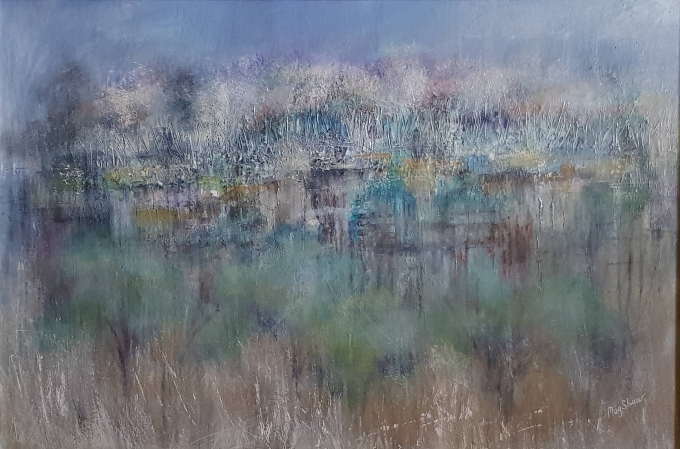 The style is impressionistic and the composition was created from a collection of remembered images from the area. I don’t paint en plein air, nor do I copy from photos. Rather, I sketch out shapes with paint directly onto a surface and use my memory and intuitive thoughts to create an image. I wait to hear a story and I hope art lovers see a story.