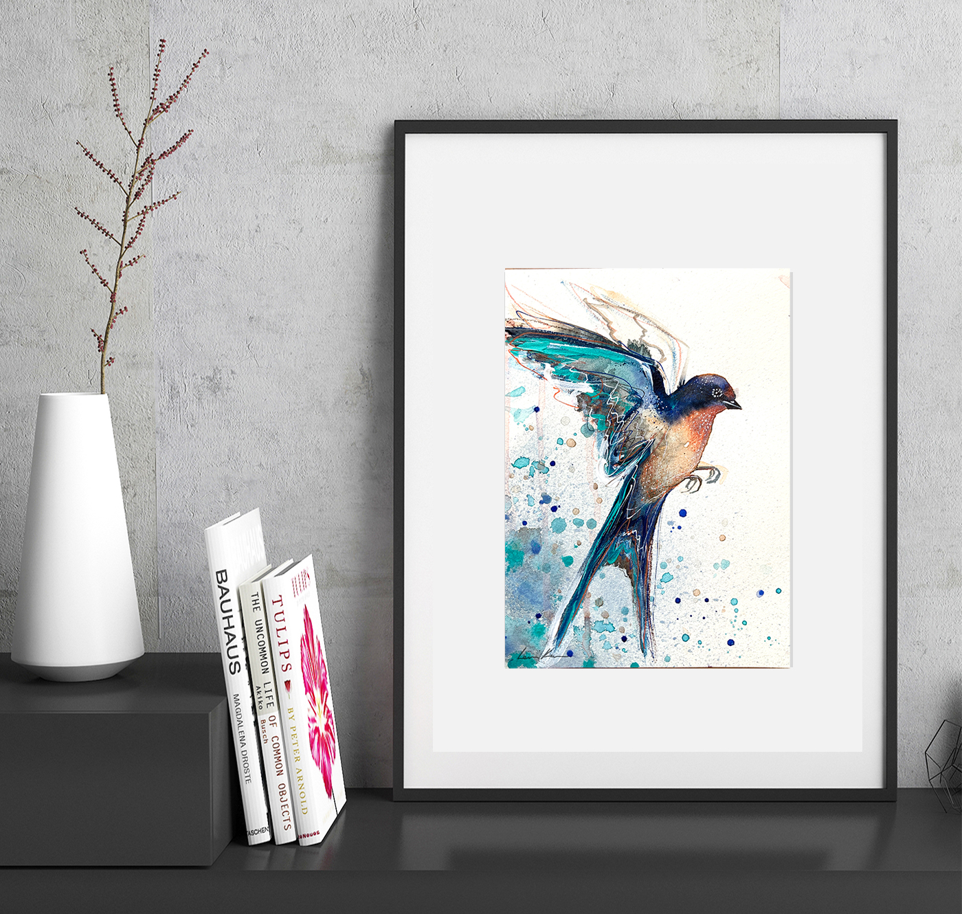 This watercolour, acrylic and ink painting by Sydney artist Leni Kae depicts a barn swallow flying; a symbol of freedom, enduring happiness and peace. A beautiful art investment of gift for bird lovers. Comes with a Certificate of Authenticity and gift card. Painted on A5 sized 300gsm paper, with matte board mount taking TOTAL size to A4.