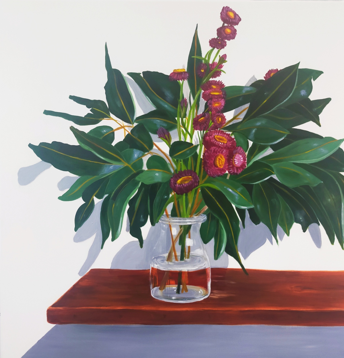 Swamp mahogany leaves and everlasting daisies – An original painting by Sigrid Patterson. Acrylic on polycotton and framed in painted, Australian timber.