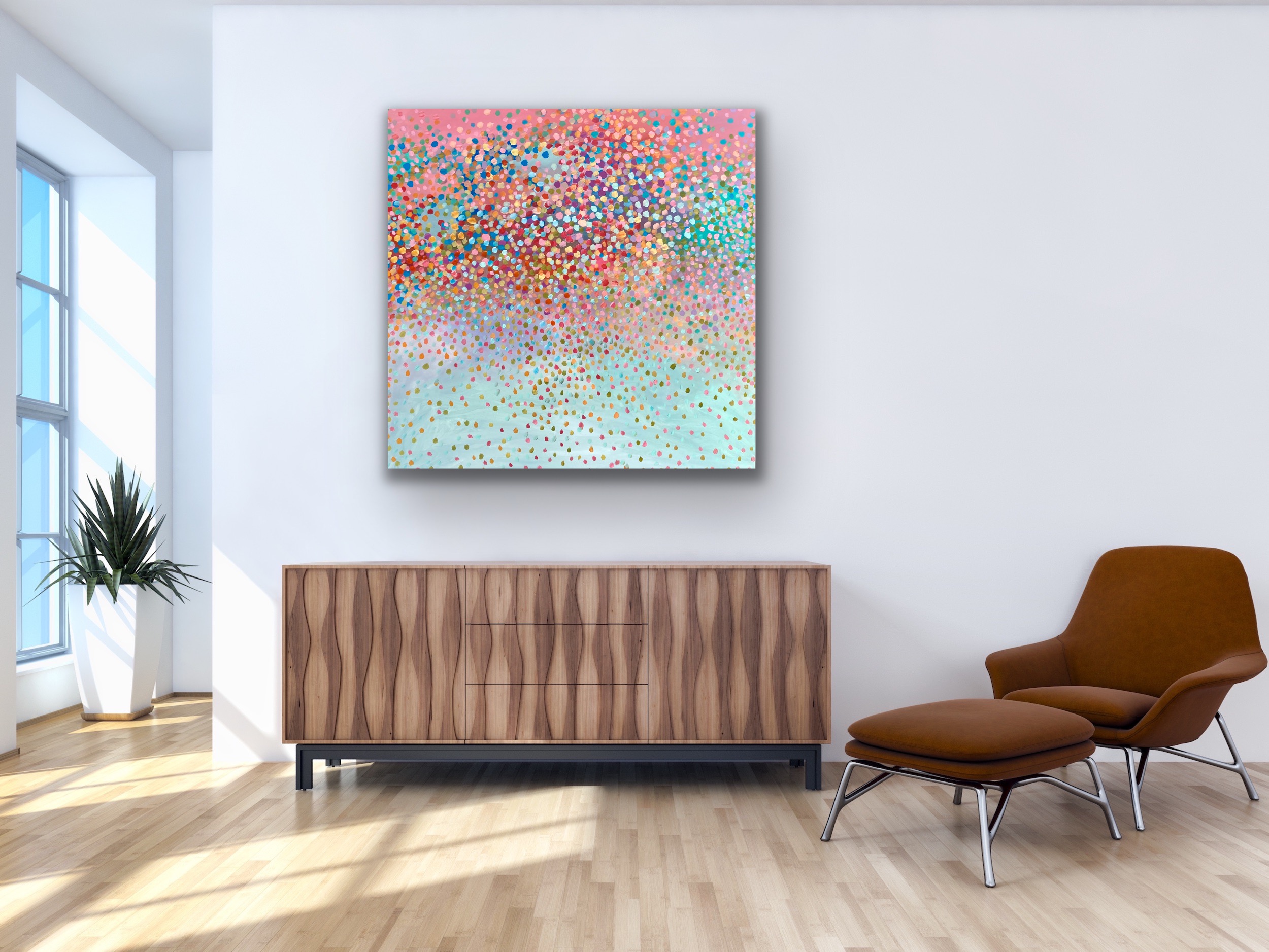 Swan Lake by Theo Papathomas – Every petal symbolises a swan taking part in this dance symphony. A composition of colours and rhythms of petals dancing over the lake creating their own dance moves . An explosion of petal colours in the sky swept by the winds like a veil covering the whole lake .This painting is painted in acrylic paints with a soft colours.The painting is signed and dated 2020 at the back and comes with a certificate of Authenticity.