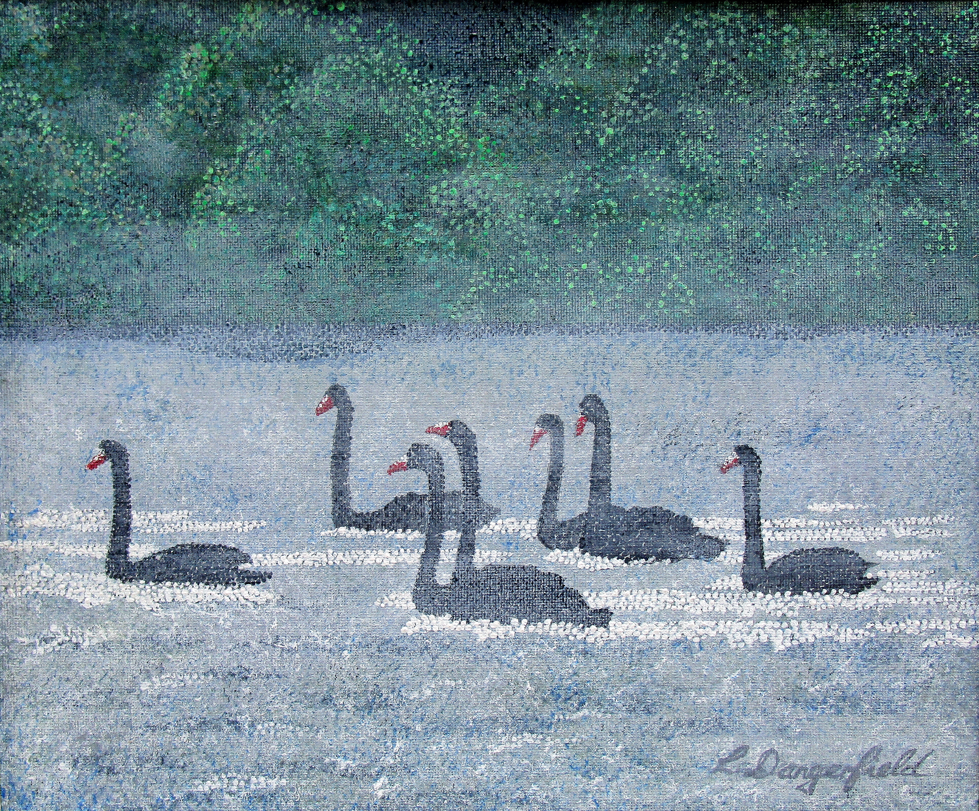I did the background by dabbing many layers of paint using a natural sponges, then did the swans, trees & waves using size # 0-3 brushes in pointillism and finally applied a very light layer of white wash over the entire painting to achieve the misty look.