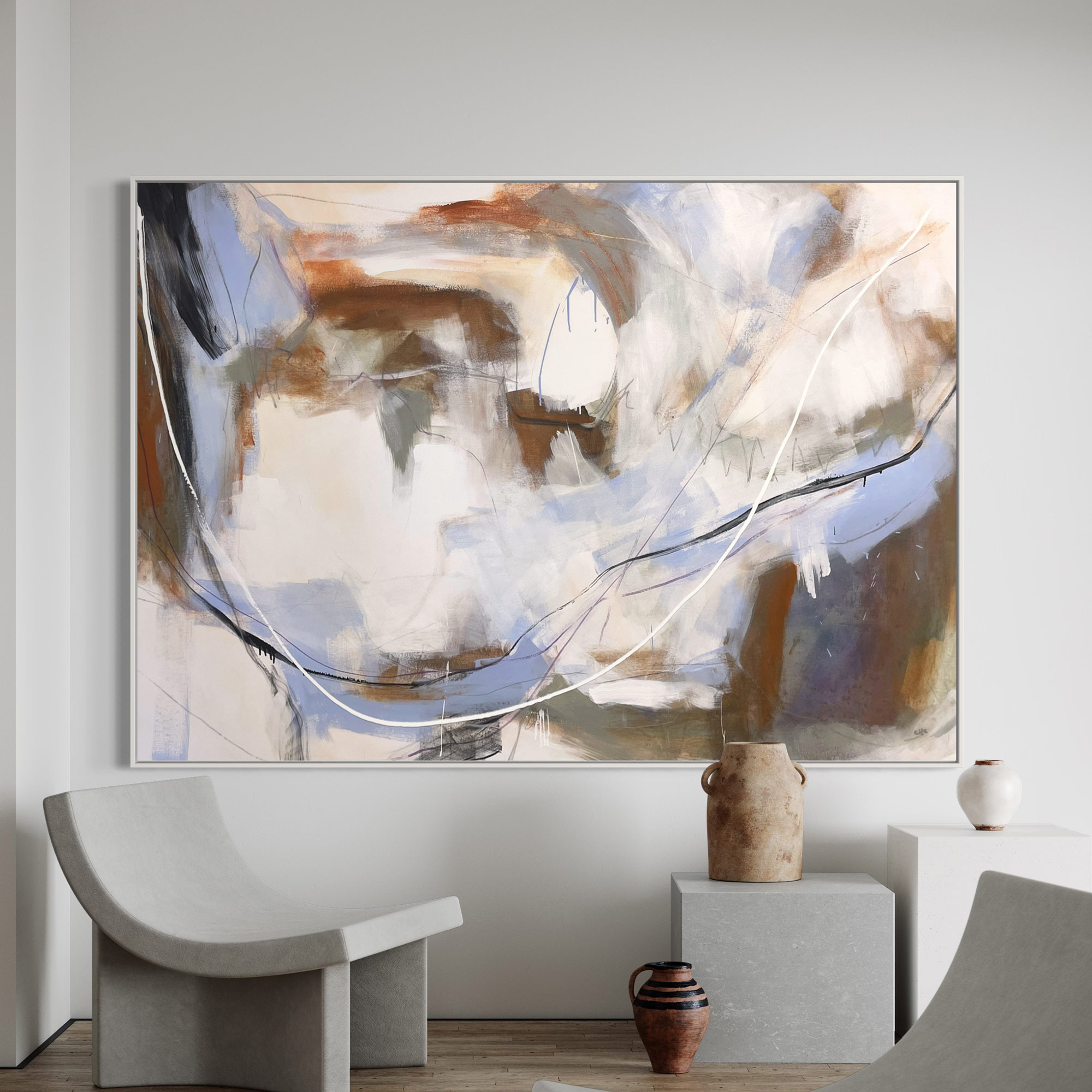 This striking statement piece combines complex mark making and texture with a beautifully balanced palette of ochre, beige, white with cool grey, black, light blue and pops of violet hues.