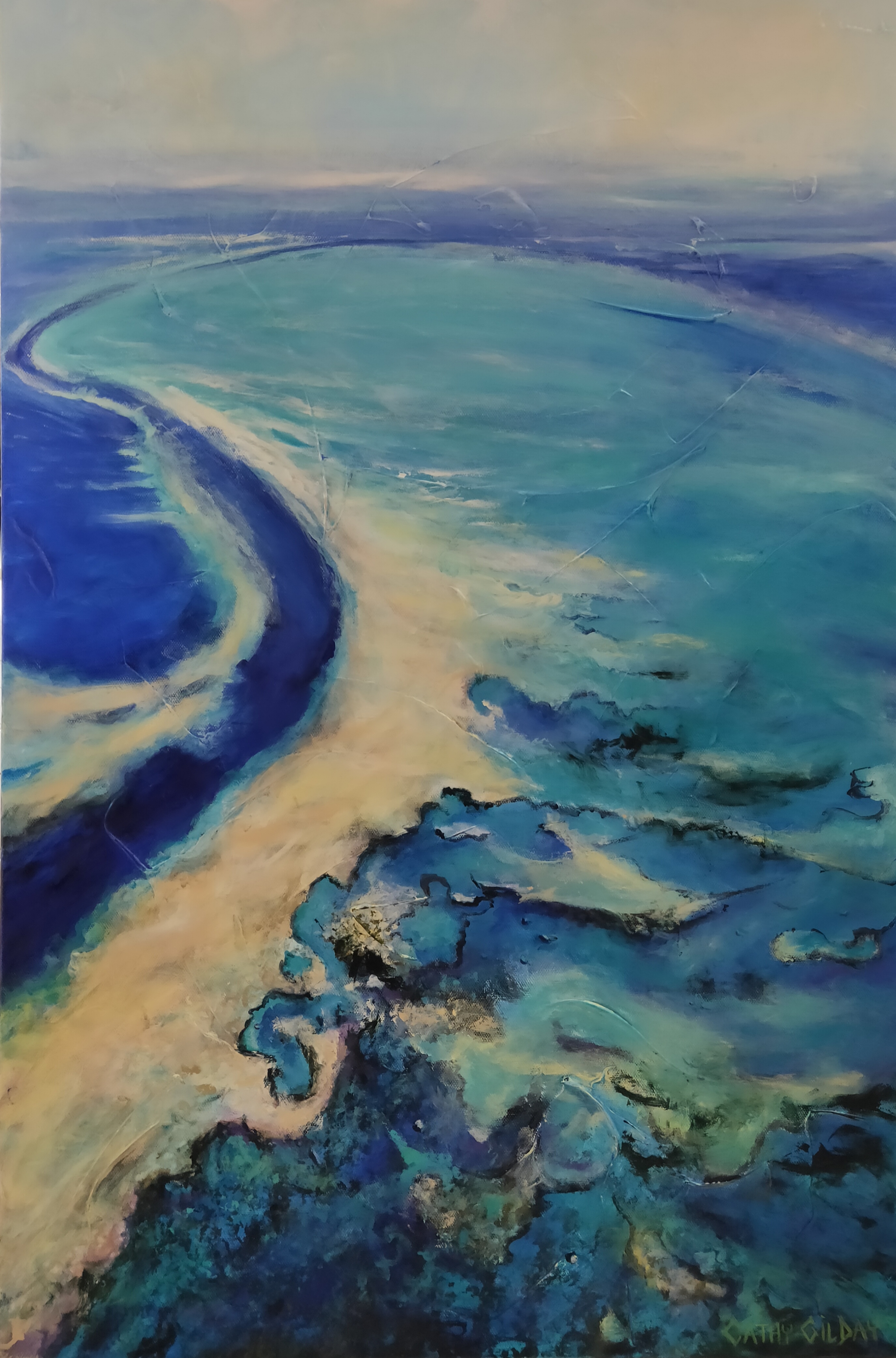 Sweeping Sundays by Cathy Gilday – This painting was inspired by Australia’s beautiful Whitsunday islands. If you have ever flown over them, you will relate to amazing colouful sweeping reefs and the gorgeous colours of the water. Sides painted, sealed and ready to hang.