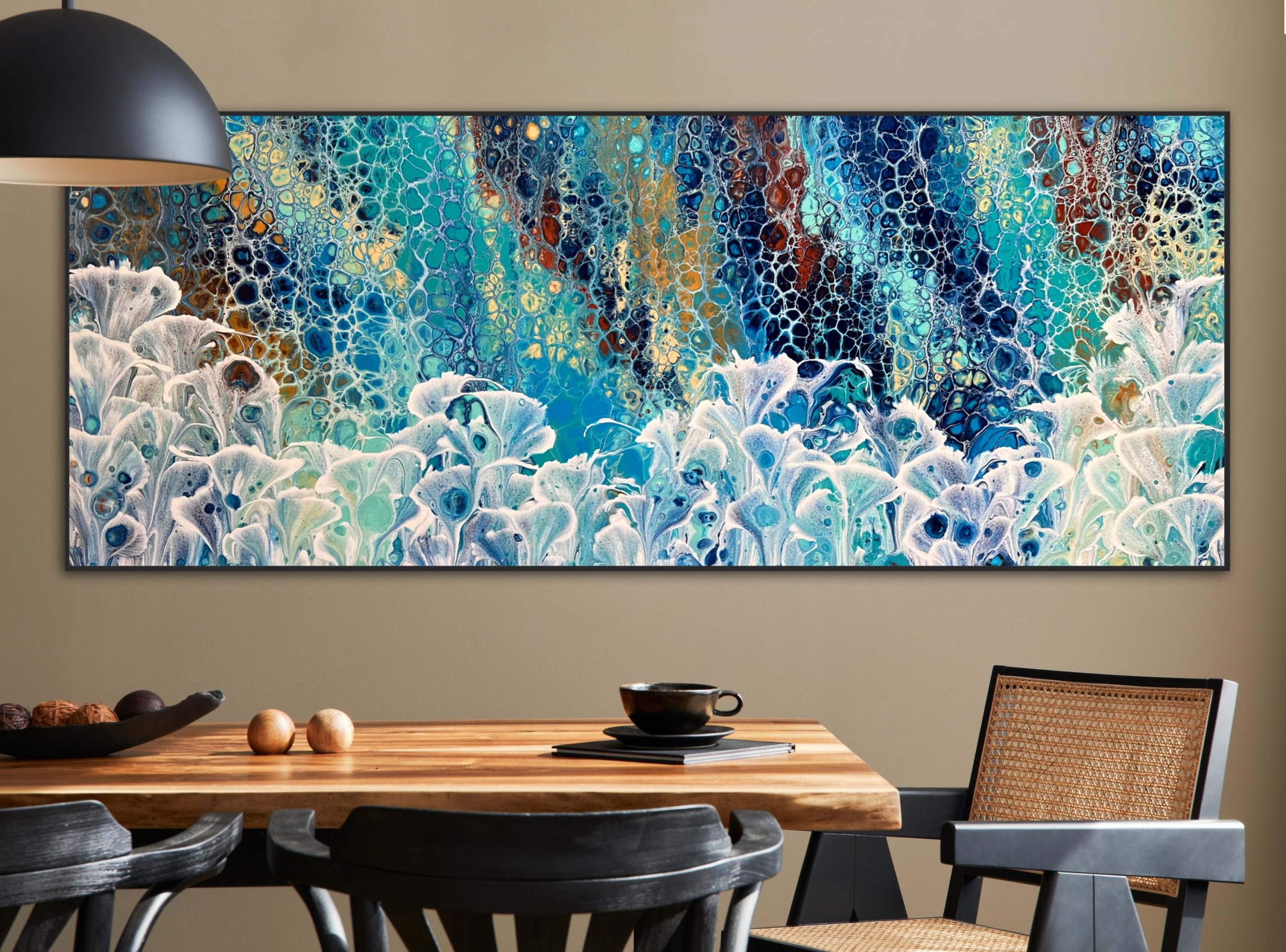 Sweeping Valley is inspired by nature and depicts in abstract Calla Lilies growing tall and in abundance with a lush valley full of colourful flora behind. Created using various techniques combined to allow increased flow, interaction and separation of colours to create interesting patterns where pops of colour can be seen emerging from underneath. This added dimension adds lace and cells to the artwork creating an interesting and one of a kind painting that can never be replicated.