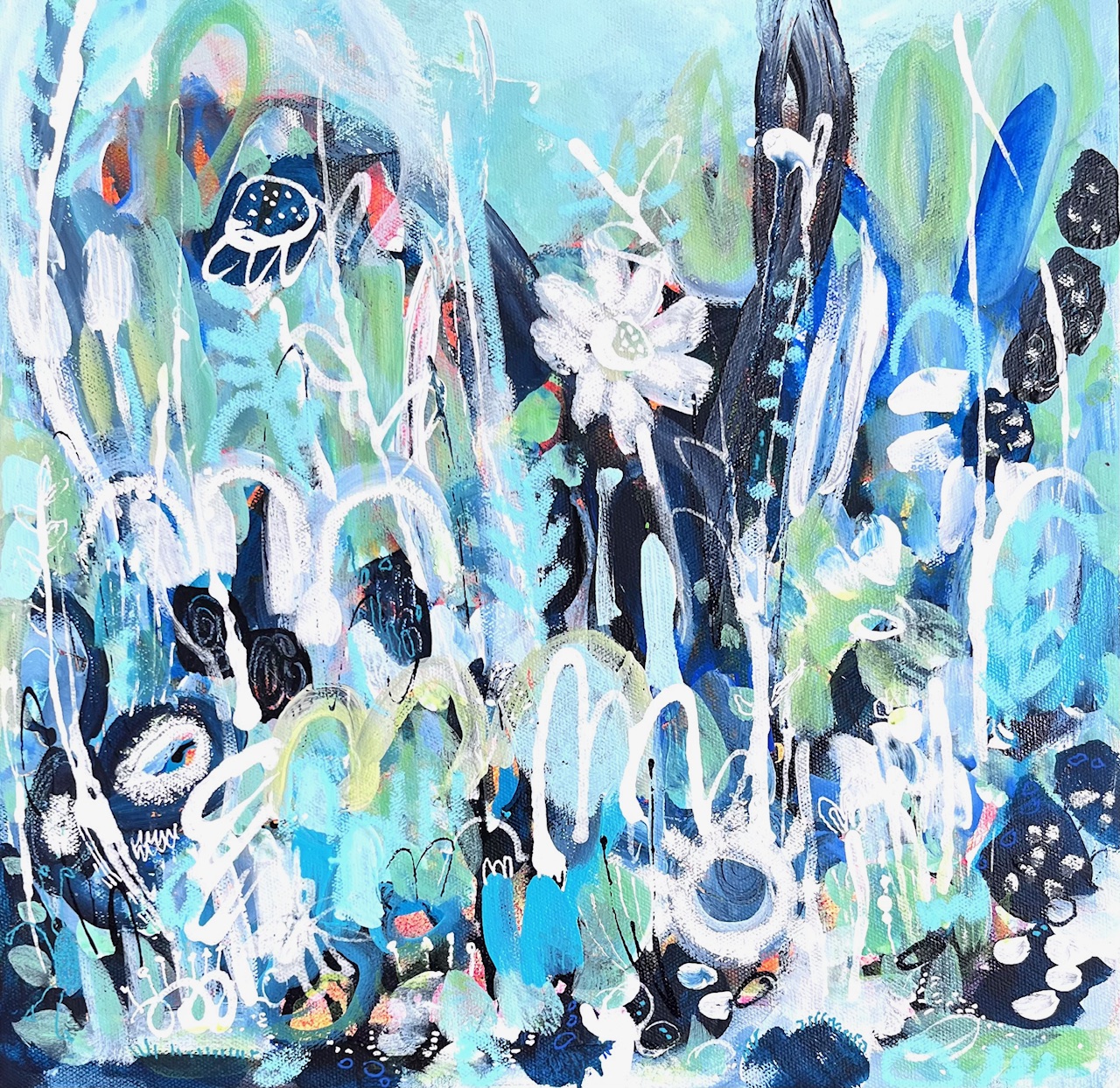 Blues & greens should always be seen. Layers of paint, creating swirls of movement in this sweet painting of joy & happiness.