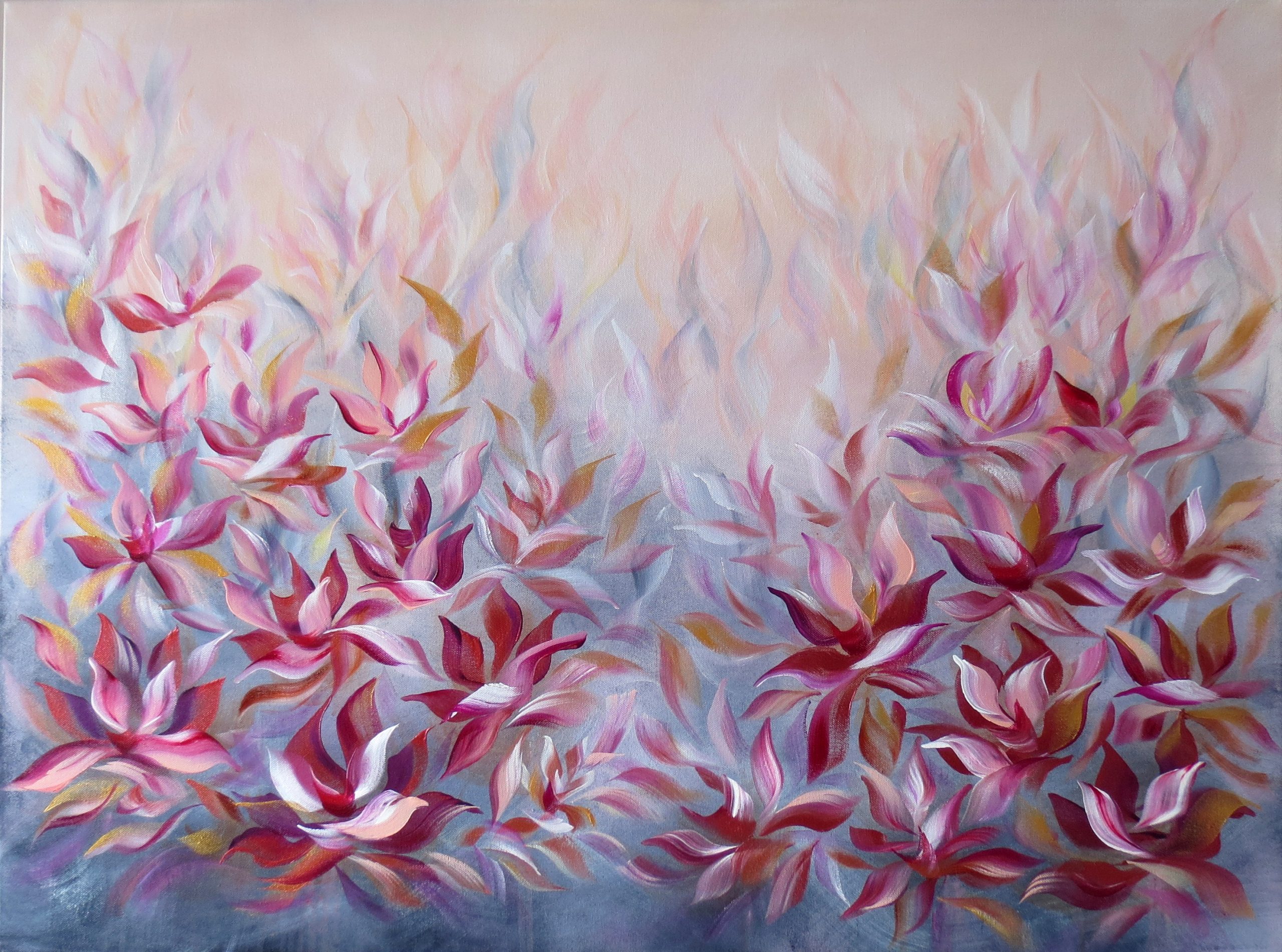 Original painting – a colour infused, eye-catching floral abstract acrylic painting stretched and ready to hang. This artwork has been finished with layers of professional grade varnish for extra protection and colour enhancement. It has a strong wire at the back.