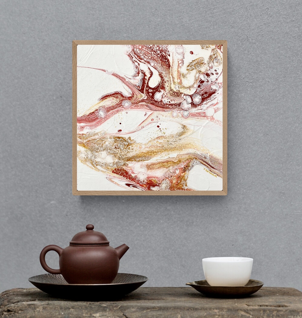 Represented by vast splashes of red and gold threads intertwined mimicking the many feelings that sweet love portrays.