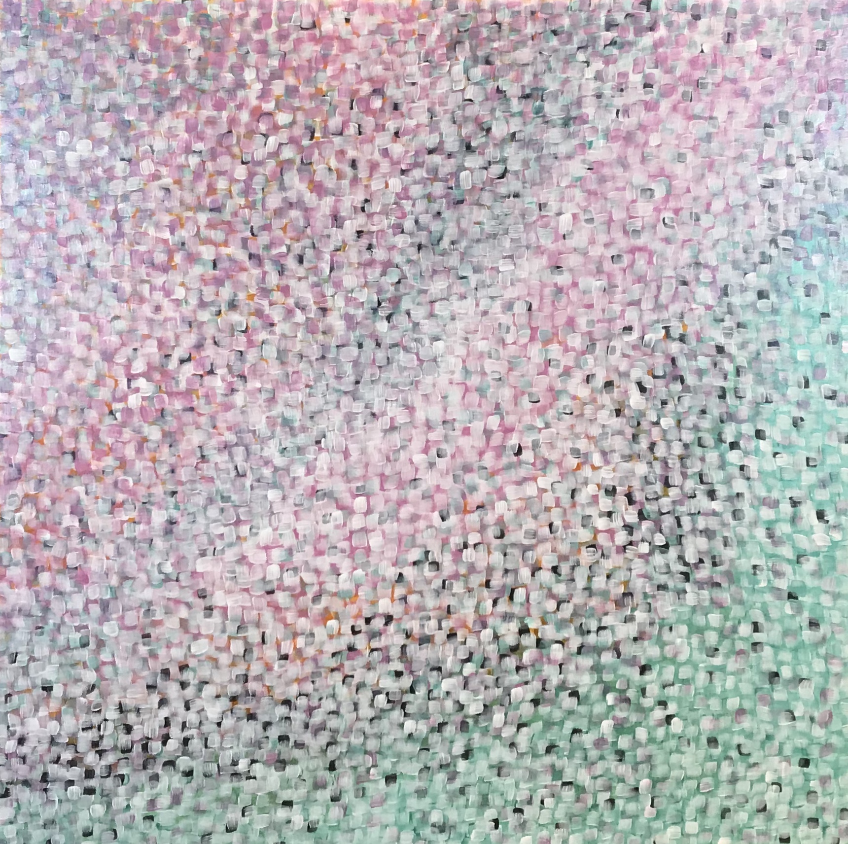 Layers of colour painted onto the canvas. Lots of squares applied, one on top of the other. Layers of pink, turquoise, white and a touch of orange and black. Lots of individual squares. Love the look.