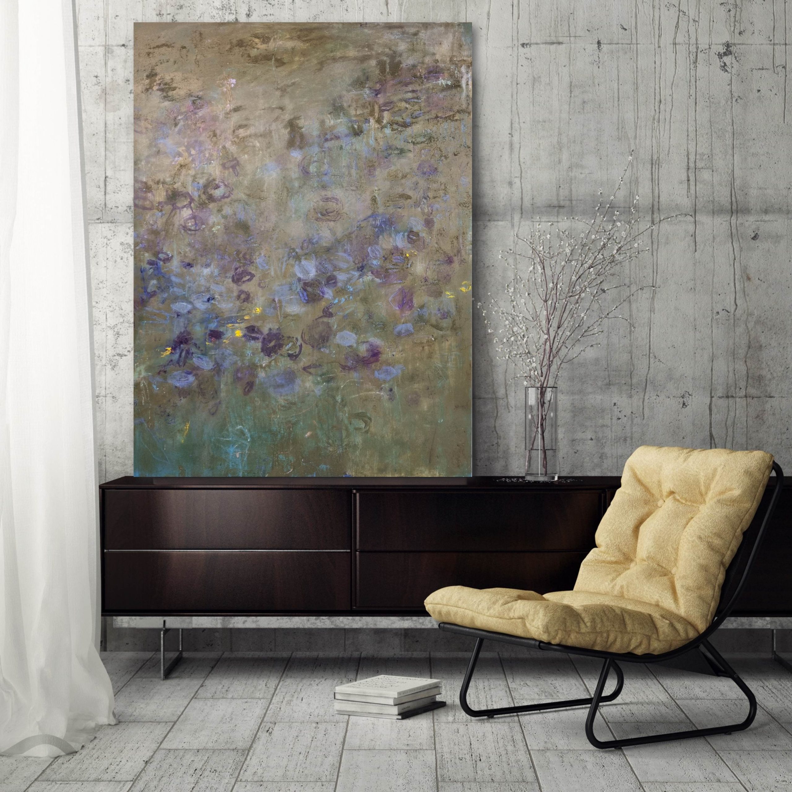 Shades, dilutions and pattern in gentle neutrals; muted rich olive alongside soft denim blue, dusty heather contrast with subtle hints of yellow and vibrant aqua/blue. Featuring expressive mark-making and gestural brushwork this painting is contemporary and ambient in calming cool and warm neutral tones.