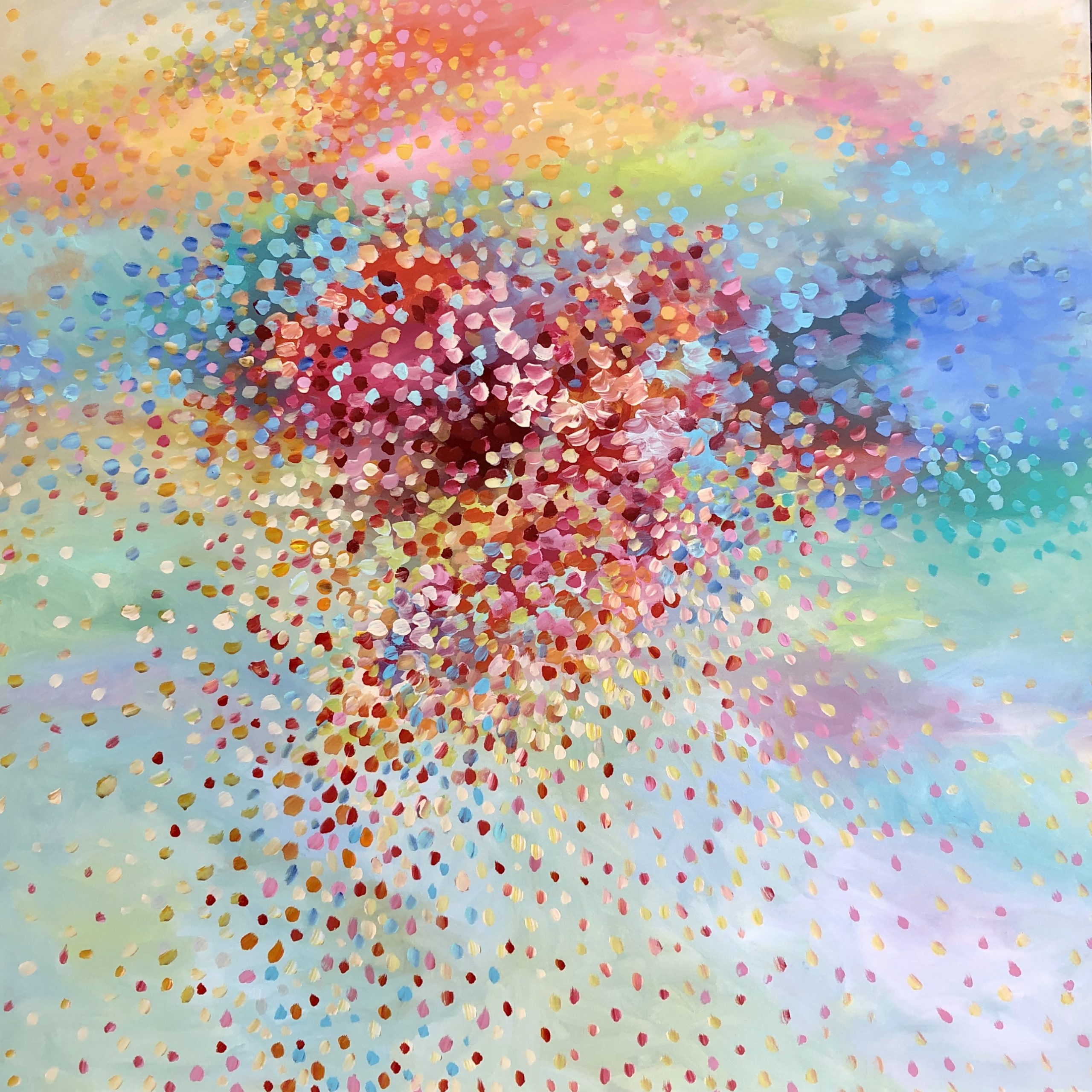 Sweet Serenity by Theo Papathomas – A very soothing and tranquil painting where sky, clouds, water and petals come together to create this beautiful landscape. Capturing the beautiful colours of the petals falling from the sky like a veil covering the whole landscape . A very harmonious and tranquil composition with so much depth. The painting is signed and dated 2020 at the back and comes with a certificate of Authenticity.
