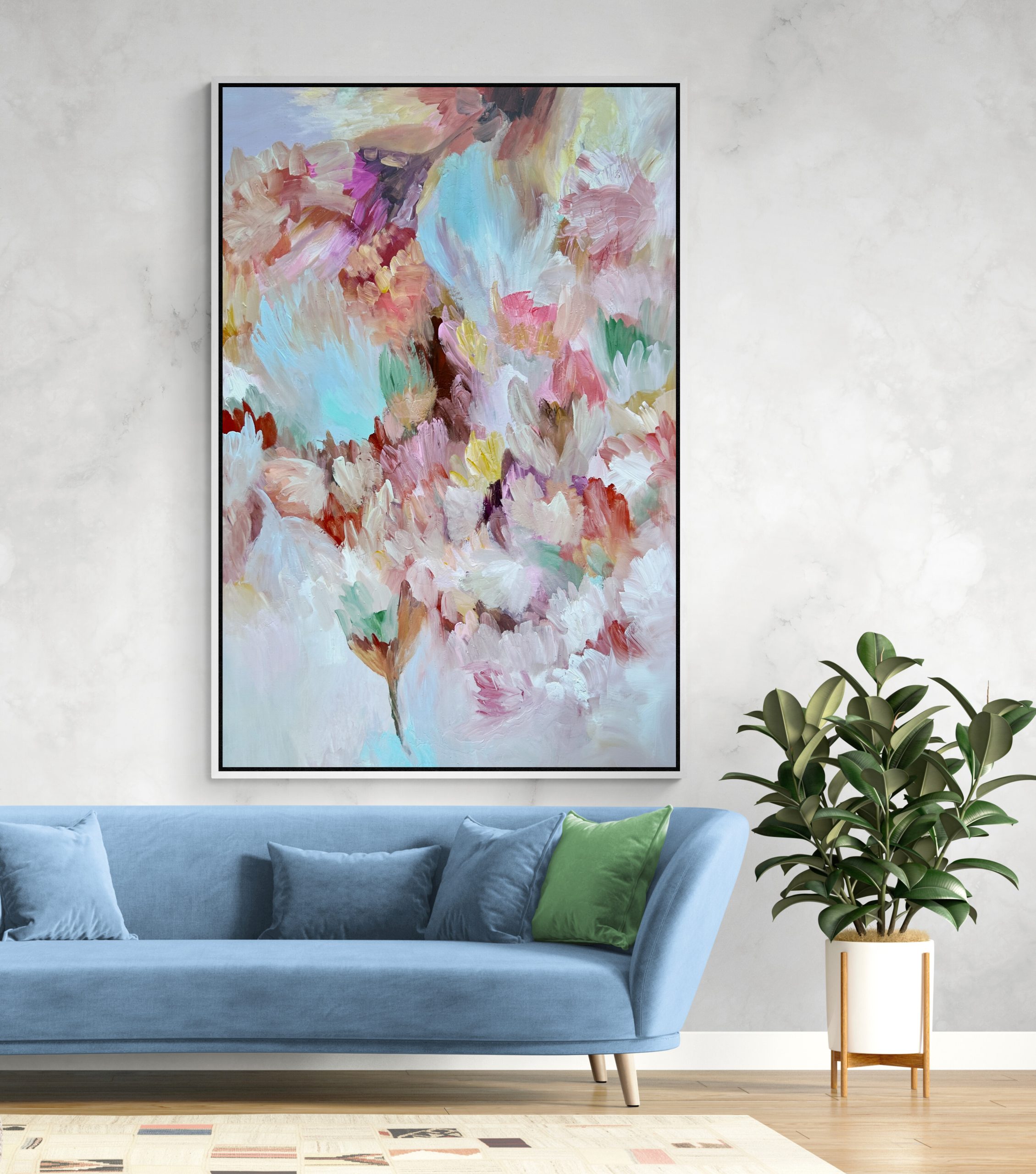 Sweet Symphony by Theo Papathomas a painting with lots of layers of paint with beautiful flower blooms and petals covering the fields. The landscape becomes a bouquet of flowers and petals dancing over the land. I tried to create this beautiful composition of colours of the landscape painted in a very expressionistic and fluid manner. Capturing the beautiful colours of the petals, like musical notes dancing over the landscape creating their own symphony . The field comes to life with the sounds of the flowers and petals creating movement and rhythms. The painting does not come with an external frame.The painting is signed and dated 2022 at the back and comes with a certificate of Authenticity.