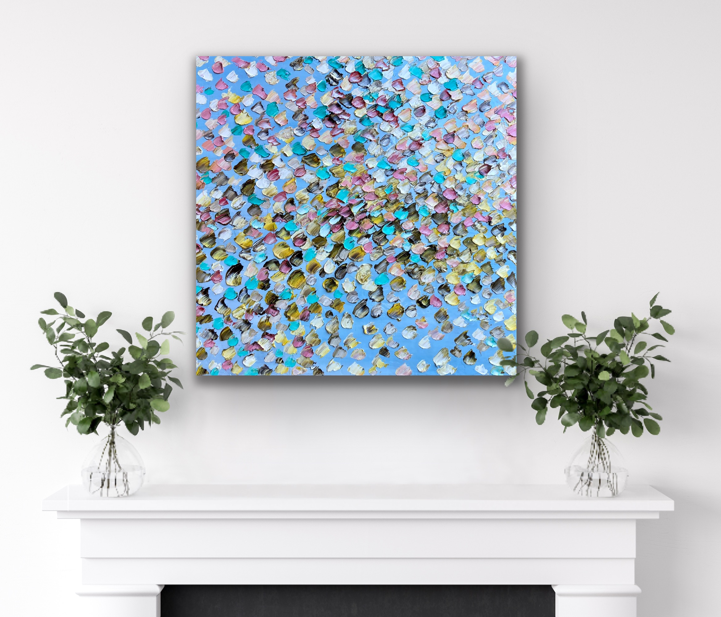 Sweetheart by Theo Papathomas  a veil of petals covering the beautiful blue sky with thick oil paints to capture the textures of the petals. The painting is painted with a pallet knife to create a lot of depth in the painting .I used the beautiful emerald green colours to capture the leaves and playing with warm and cool colours . A very textured painting with so much depth by creating lots of layers of paint giving it a three dimensional feel .Weeping petals swept by the winds creating this musical Bouquet in the sky. Every petal represents a blessing from the Sky. Hope this painting makes the viewer feel peaceful and tranquil.The painting is signed and dated 2021 at the back and comes with a certificate of Authenticity.