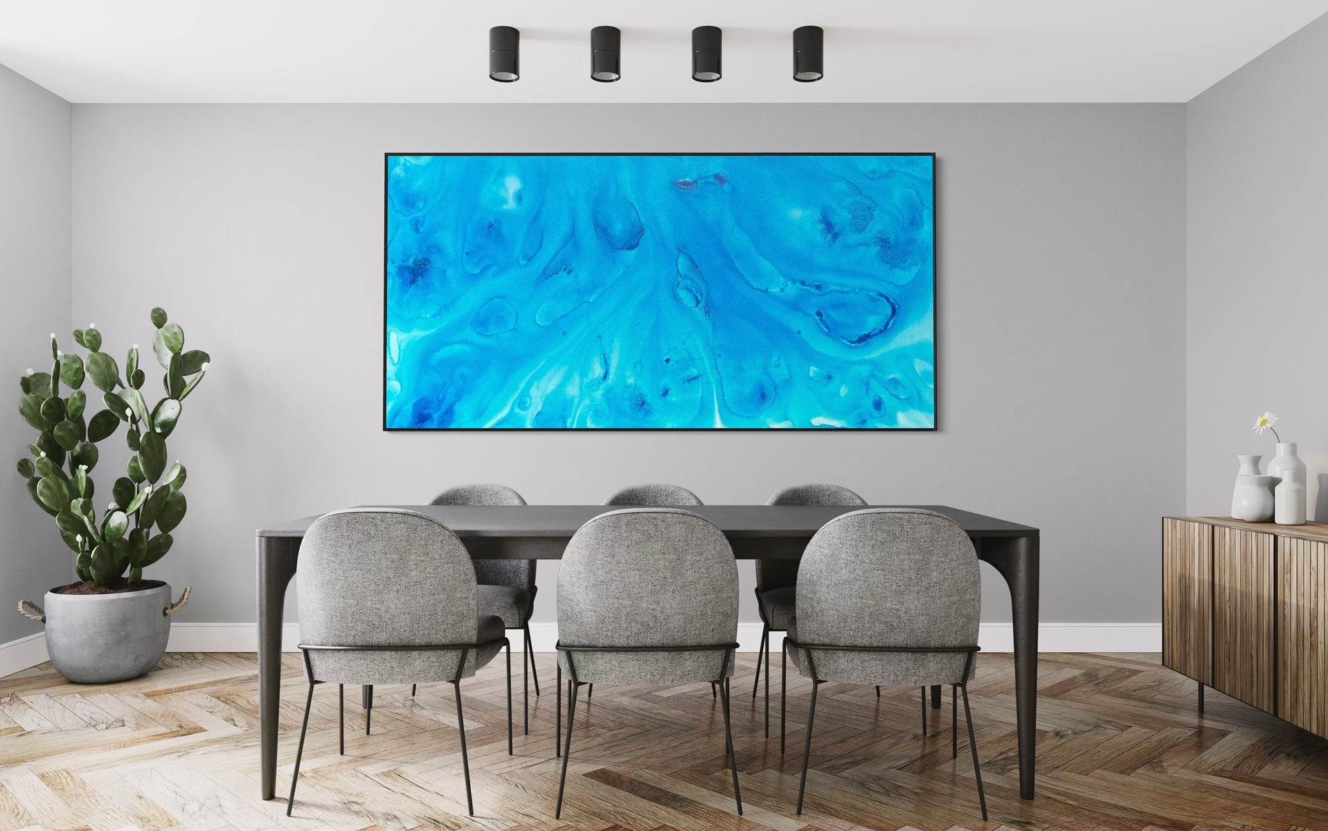 Immerse yourself in the serenity of Swimming in Paradise, a captivating artwork that transports you to a tropical waterway. This stunning piece is a celebration of blues, with a mesmerizing blend of deep turquoise, soft aquas, and rich cerulean hues that create the illusion of glistening, sunlit water. The fluid movement of the brushstrokes invites you to dive into the scene, evoking the peaceful essence of a secluded paradise.