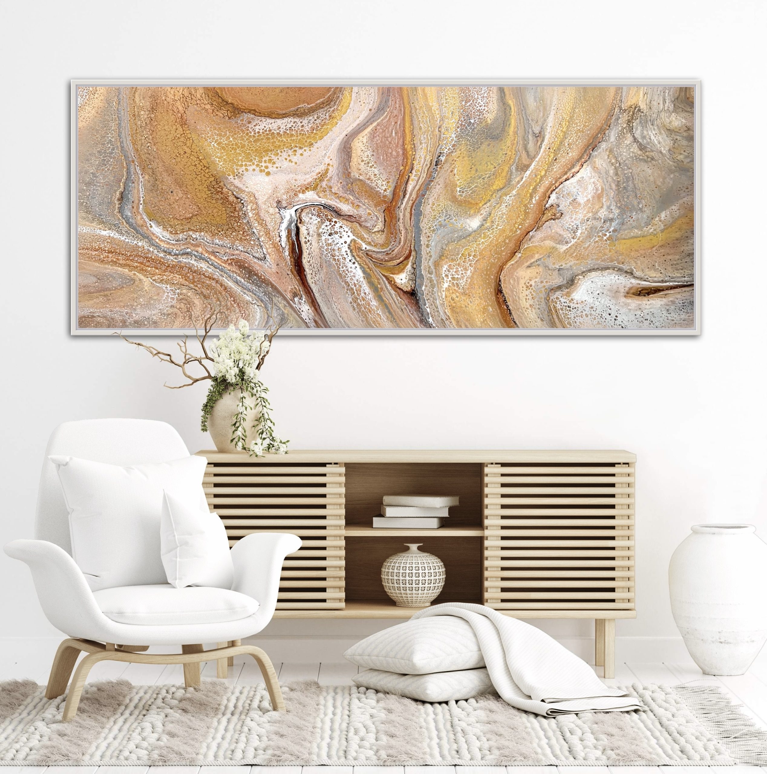 Swirling Sands was created using various techniques combined to allow increased flow, interaction and separation of colours to create interesting patterns where pops of colour can be seen emerging from underneath. This added dimension adds lace and cells to the artwork creating an interesting and one of a kind painting that can never be replicated. A lovely variety acrylic pigments were used including metallic yellow & rose gold, bronze, copper, silver, grey, cream, black and white.