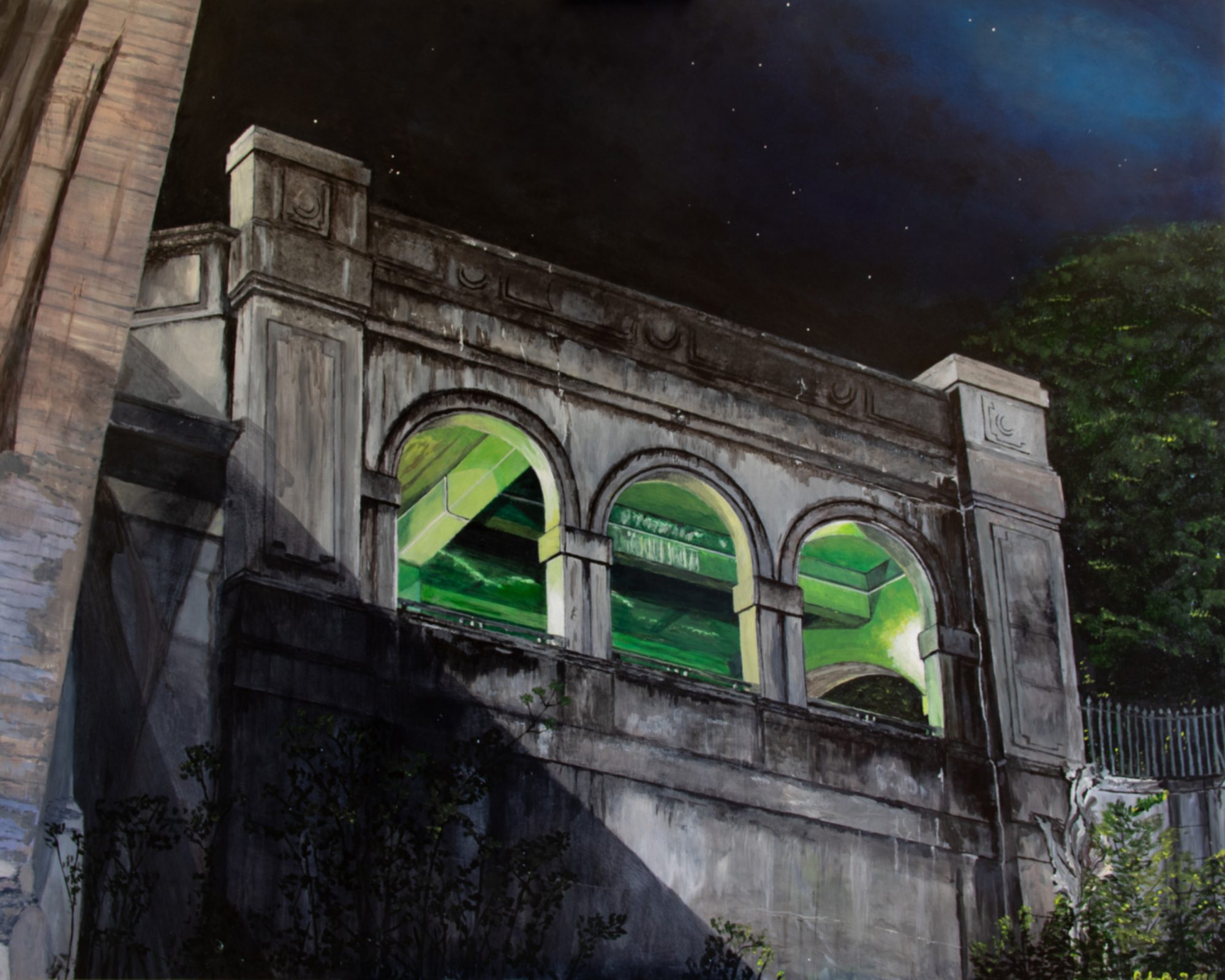 One of the best times to see the entrance way is during twilight when long shadows travel across its aged walls of concrete. I was mesmerised by the soft green light emitted from the vestibule in this image. The colour combined with the shadows remind me of the illustrations in a child’s storybook. I feel like this building belongs in the Emerald City; this is the entrance to a great palace where the Wizard of Oz can grant a person’s wish.