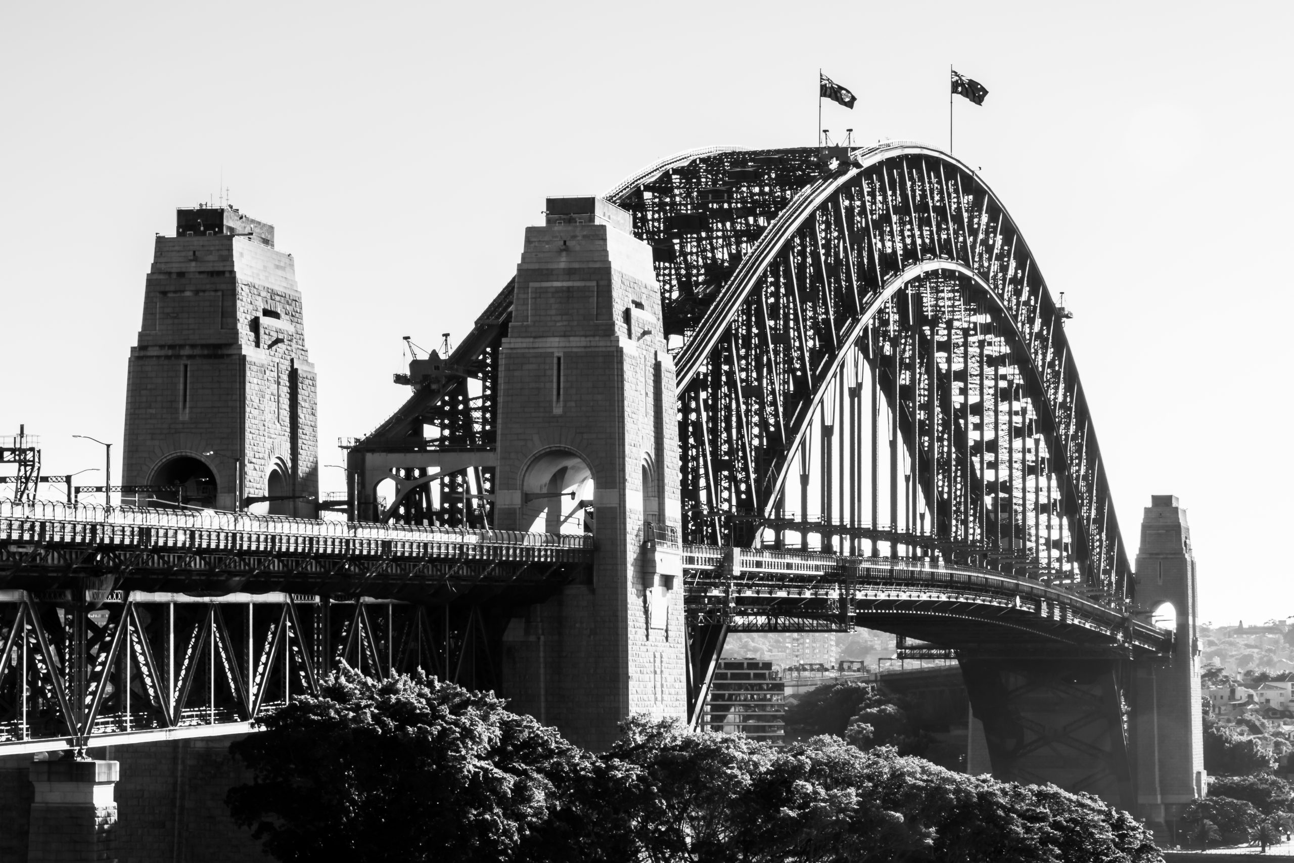 This daylight black and white photo of the Sydney Harbour Bridge reveals the beauty of its iconic lines, textures, and architectural strength.