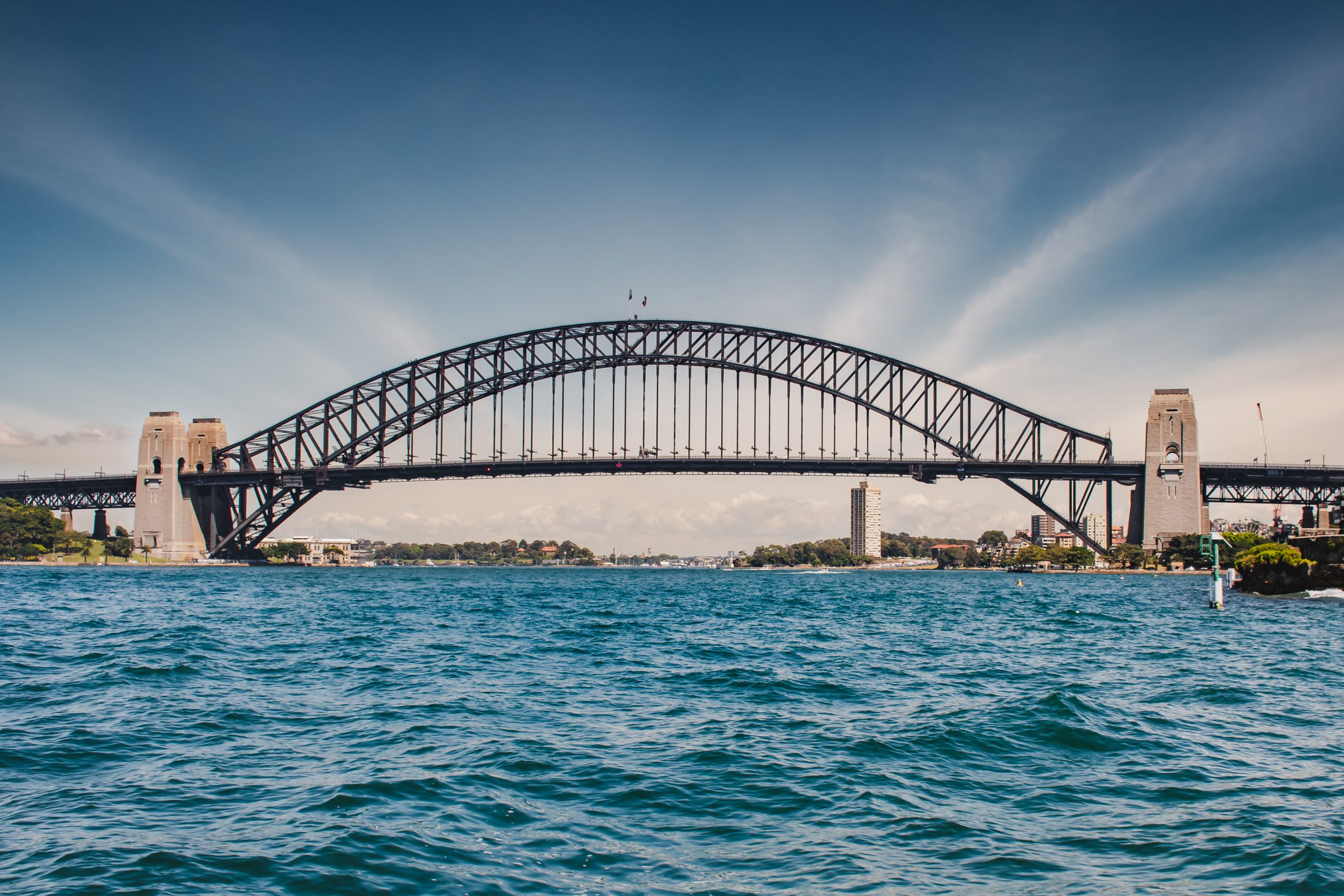 Wispy cirrus clouds arc over the Sydney Harbour Bridge, creating a natural frame and lending the scene an atmospheric depth above the vivid blue waters below.