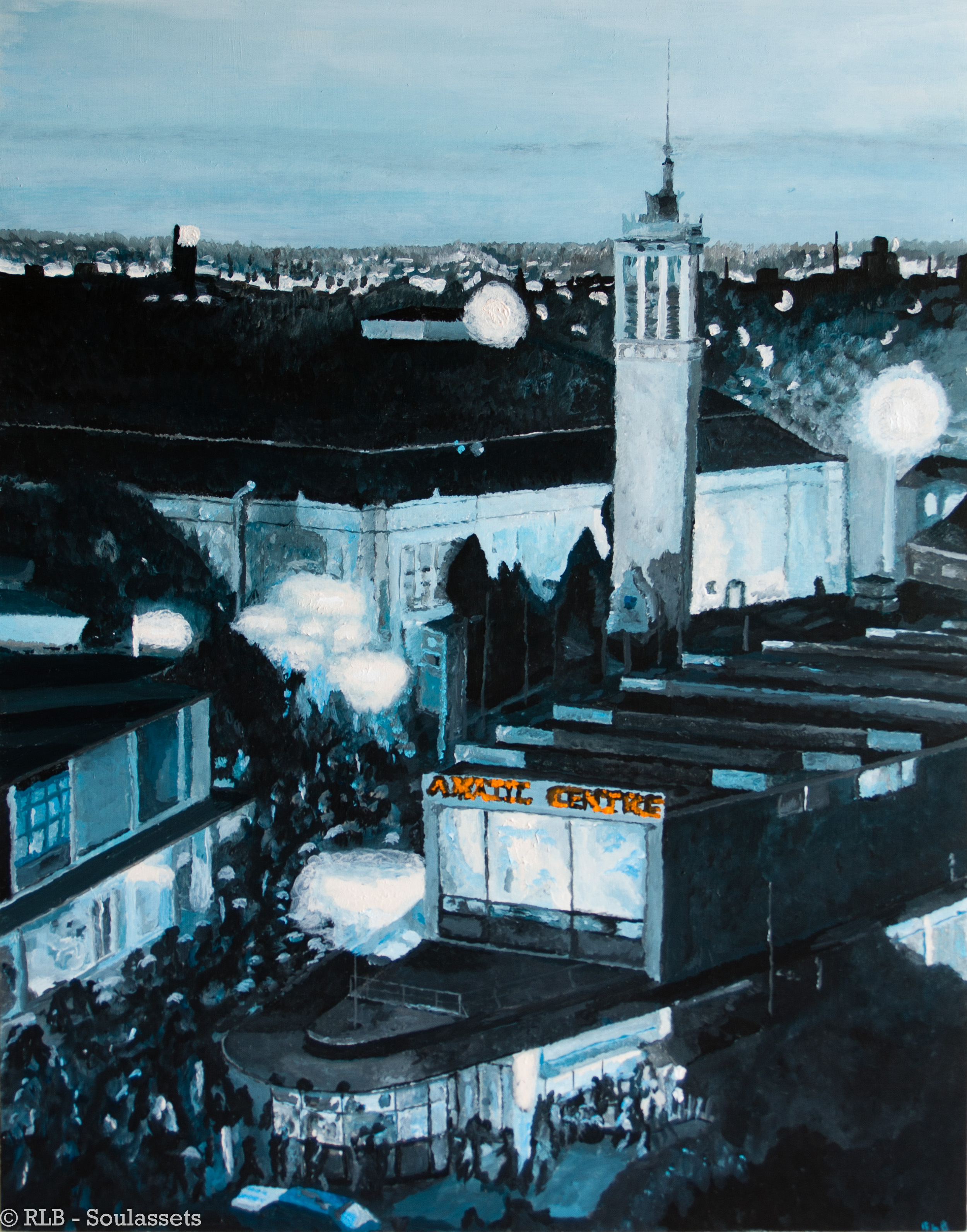This artwork is part of my grey tone series and is painted from the steps leading up to the Victor Trumper Stand. I was on my way to see the 9 pm fireworks and had just come from the Hordern Pavilion, depicted in the middle of the painting, after buying all of my one dollar showbags.