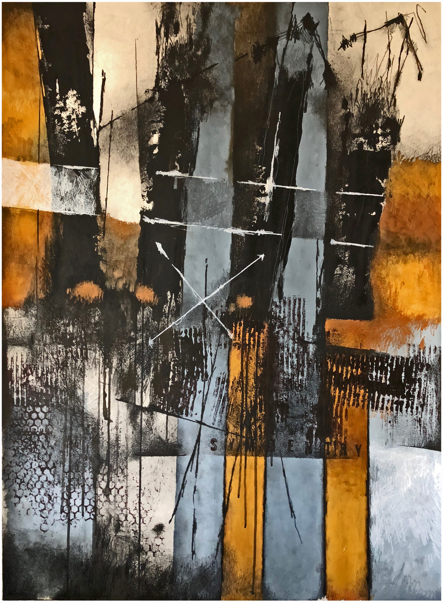 “Symmetry” is an original mixed media artwork on Lana 300 gsm paper that includes the use of pencils [layered and various types], paint. inks, oil sticks, stencils and hand formed printing objects. The basis of this work is an inner reflection of moving through emotion. Allowing to indulge in it and be able to move through it to get to a better place.