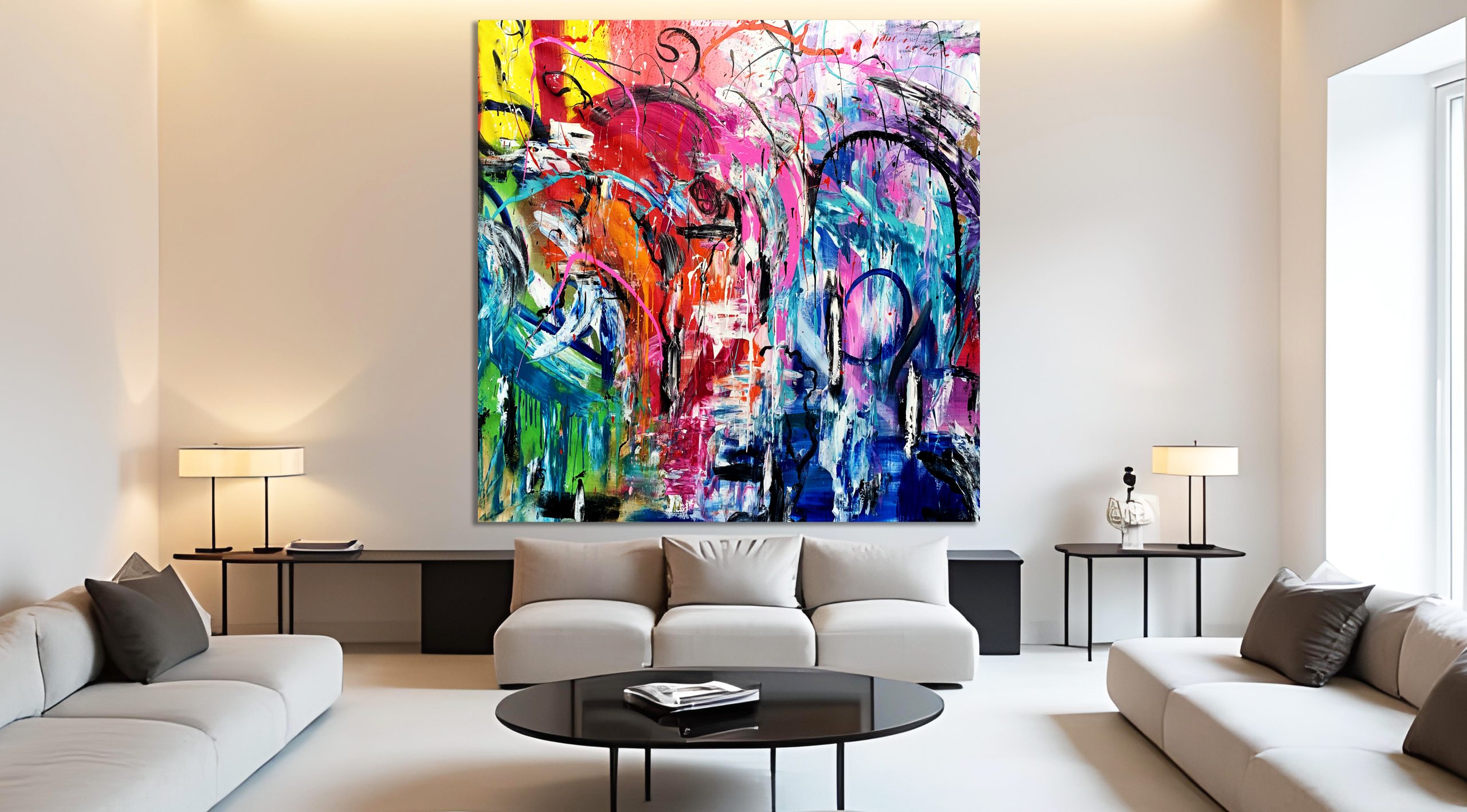 This work is painted on professional-grade canvas and has been sealed with varnish. The canvas is 170 cm in width by 170 cm in height. The painting is larger than this to allow for a colour wrap, so that the sides are painted in the same manner as the surface. Therefore no frame is required.